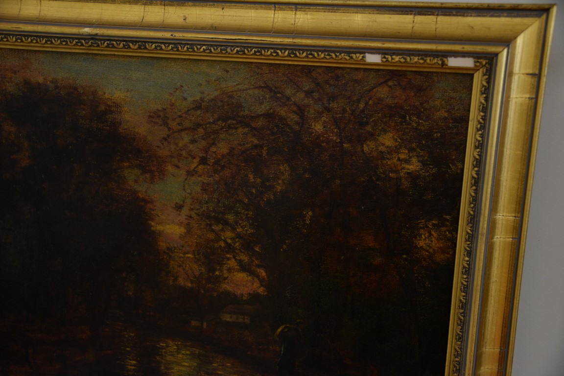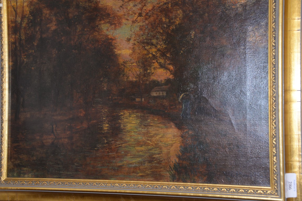 Lot 286: William Edward Plimpton 1857-1940, oil on canvas, Sunset Walk on River’s Edge, signed lower left: W.E. Plimpton 1902, 16 x 20.
