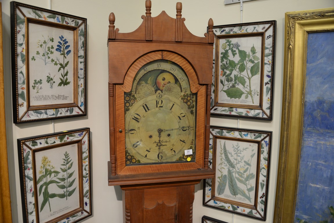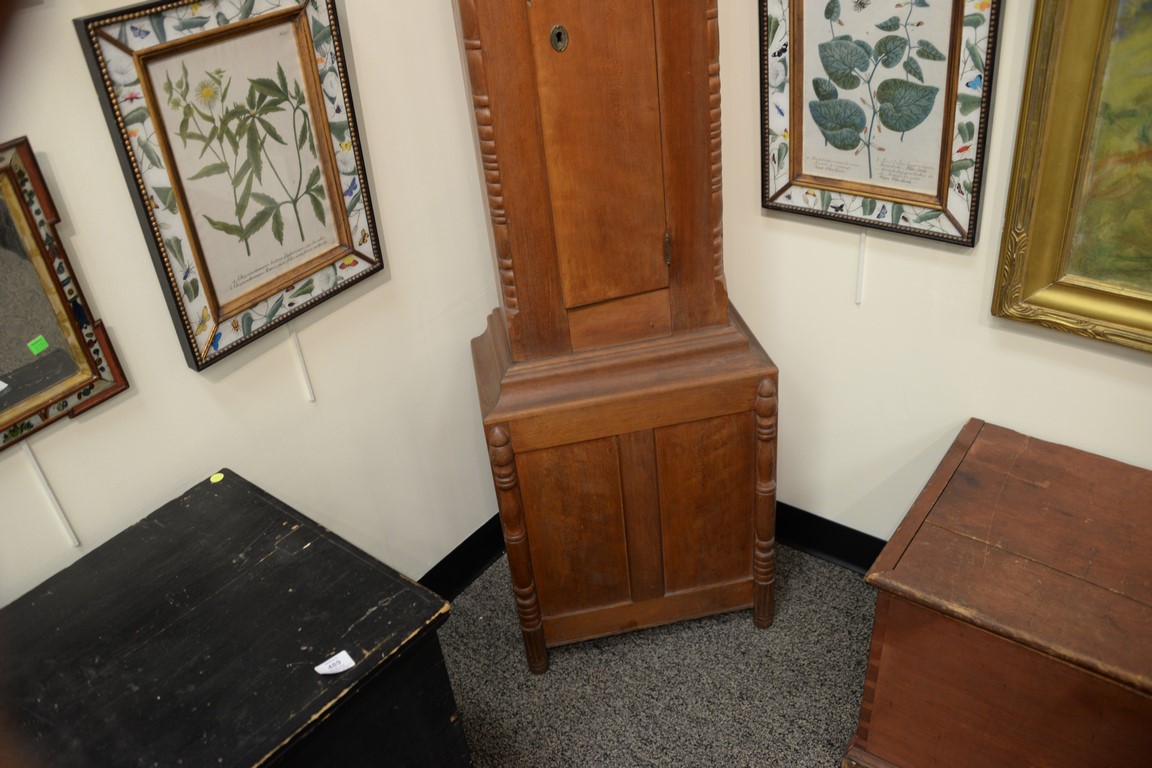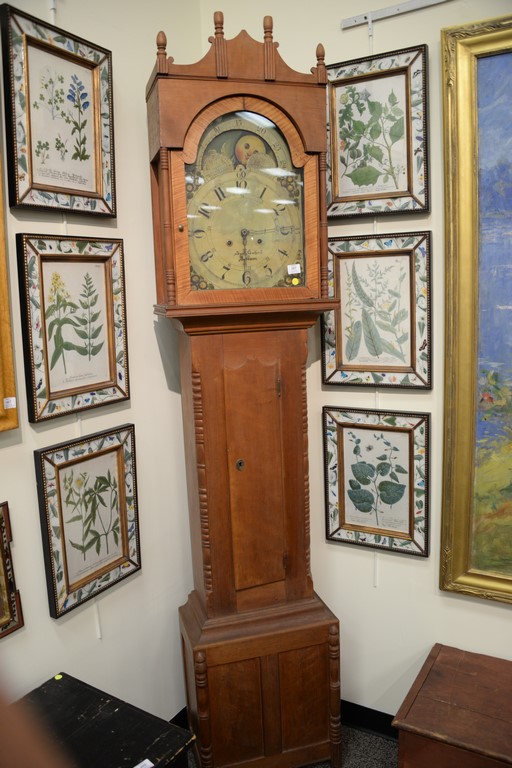Lot 287: Cherry tall case clock having arched top over tombstone tiger maple door, all flanked by turned columns set on turned legs with bras…