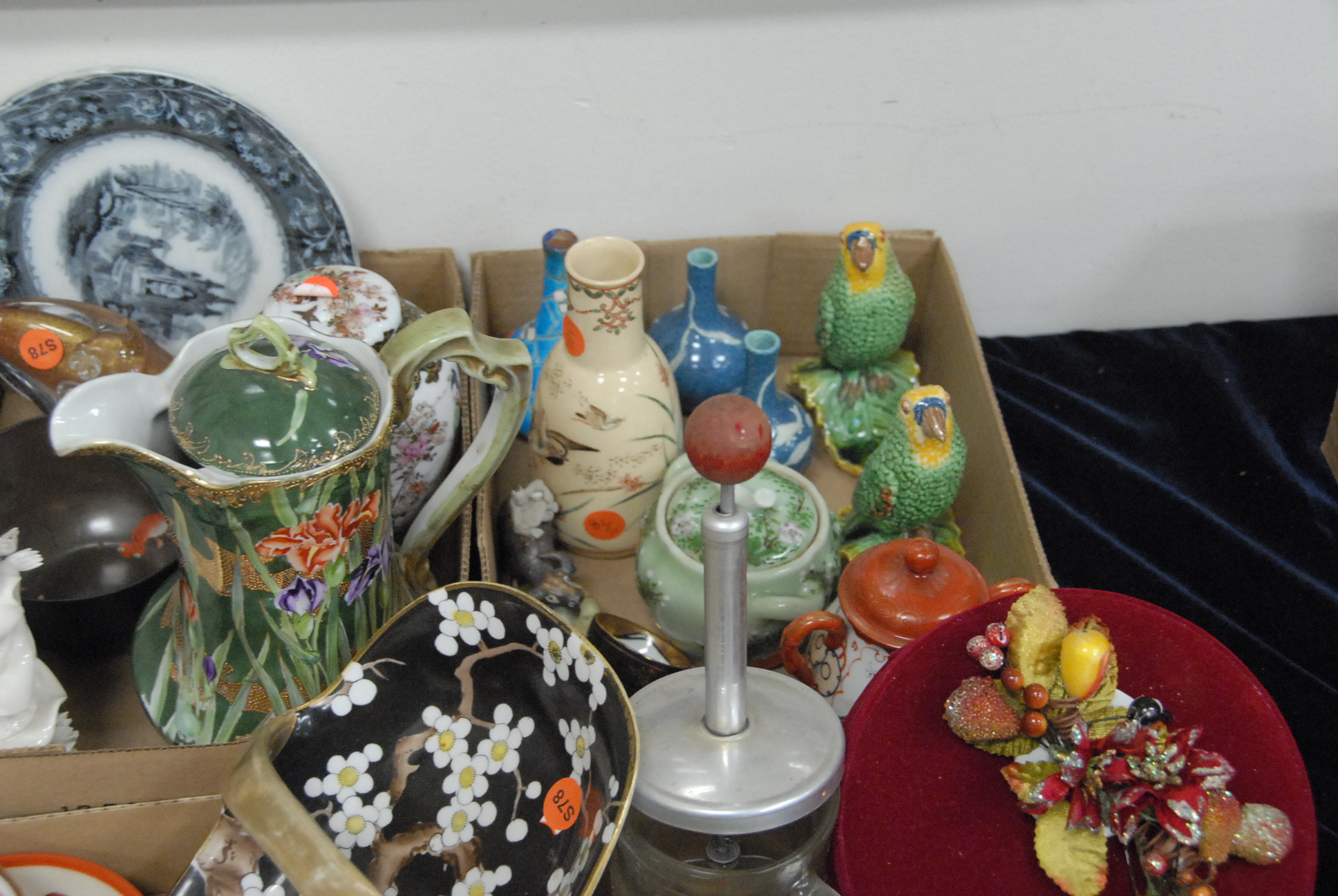 Four box lots of china including two Chinese tea caddy’s, two Japanese plates, Japanese and Chinese dishes, and small vases, pair of majolica parrots.