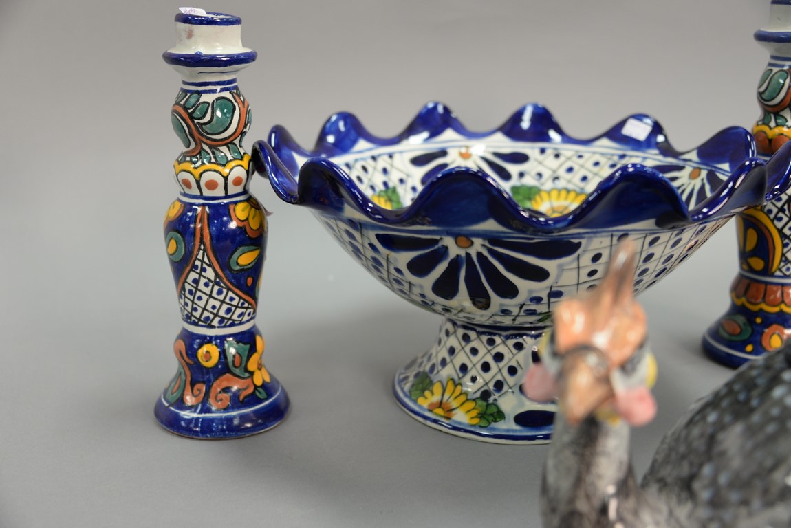 Four piece lot including Italian Majolica game bird tureen and ladle, large bowl, and candlesticks. candlesticks: ht. 10 1/2 in., large bowl: ht. 7 1/2 in. dia. 13 in.