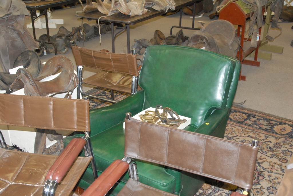 Four piece lot three chrome and vinyl chairs and vinyl green easy chair.