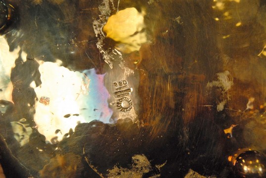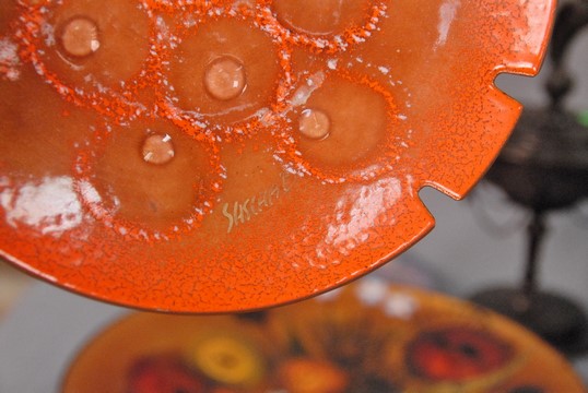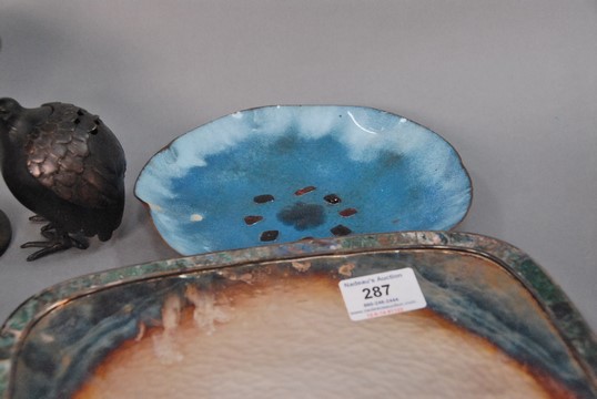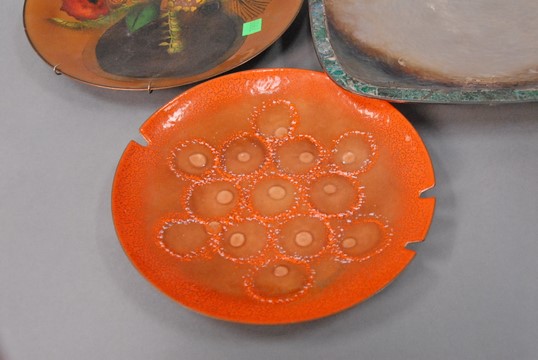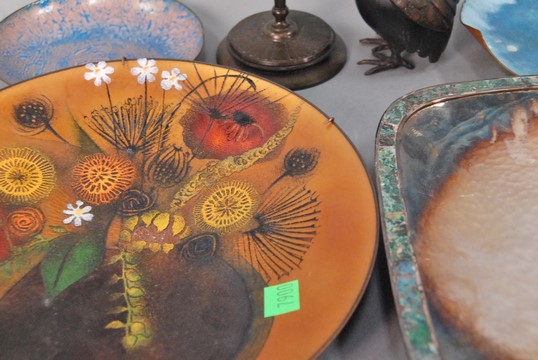 Group of five tray and enameled pieces to include Sascha Brasoft tray, Castillo Mexico silver tray with stone border, Sylvester tray, two small trays, and two bronze pieces. smallest: dia. 5 1/2 in., largest: 10 x 10