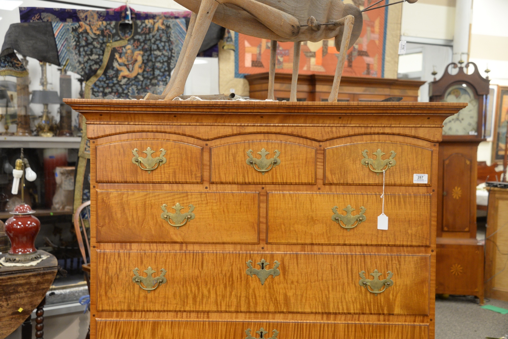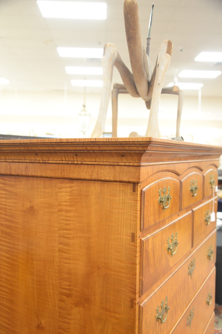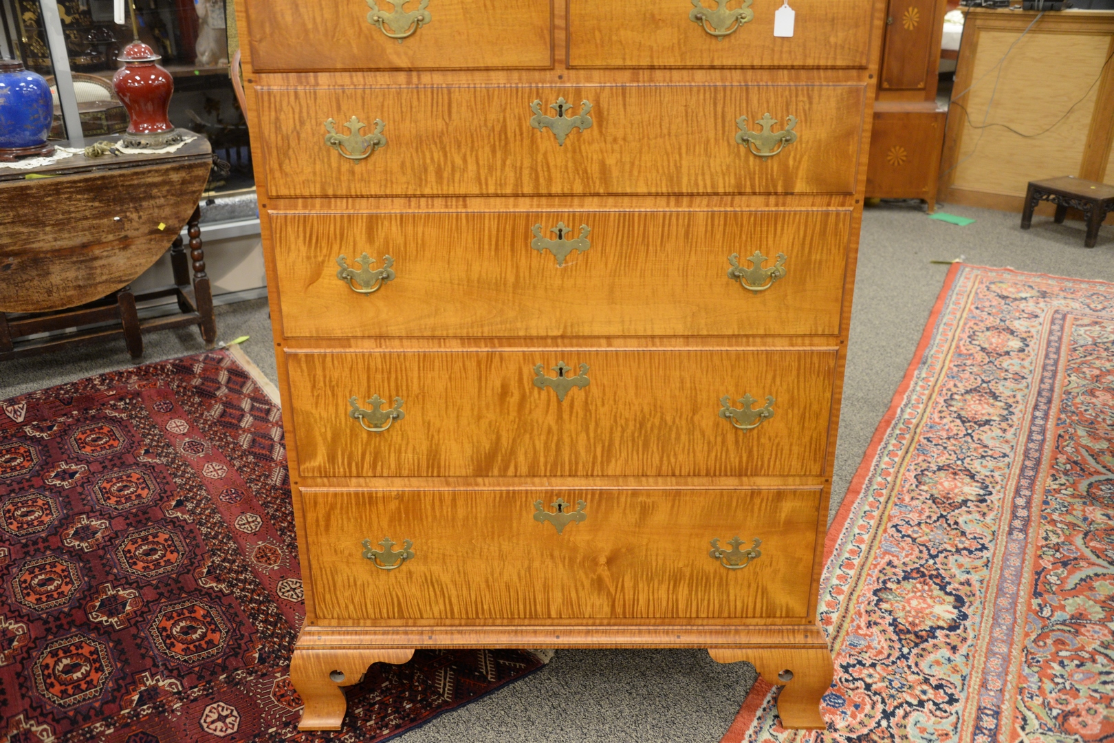 Lot 287: Irion Company Custom Made Chippendale Style Tiger Maple Tall Chest, having three drawers over two drawers over four drawers set on ogee feet, signed Irion Company Furniture Makers, 64 1/2 inches, width 38 inches, top 22 x 42 1/4.