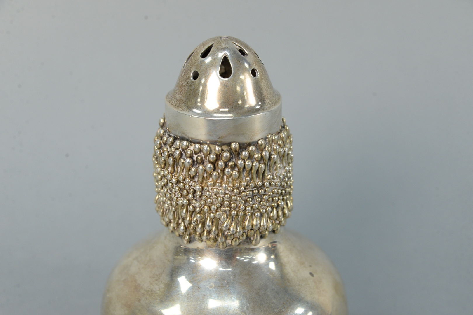 Jocelyn Burton Silver Castor with crustaceans on neck height 5 3/4 inches 13 troy ounces. Provenance: The consignor’s late husband, Philip Refson, owned the Charles de Temple jewelry shop on Jermyn St, London in the late 1970’s through early 90’s. Charles de Temple and Jocelyn Burton were friends, and he carried many of Jocelyn’s silver pieces in his store. Mr. Refson became a private client and personal friend of Jocelyn’s during this time and often commissioned pieces directly from Jocelyn. The chargers and the bull place card holders Philip was a Taurus are examples of commissioned pieces.