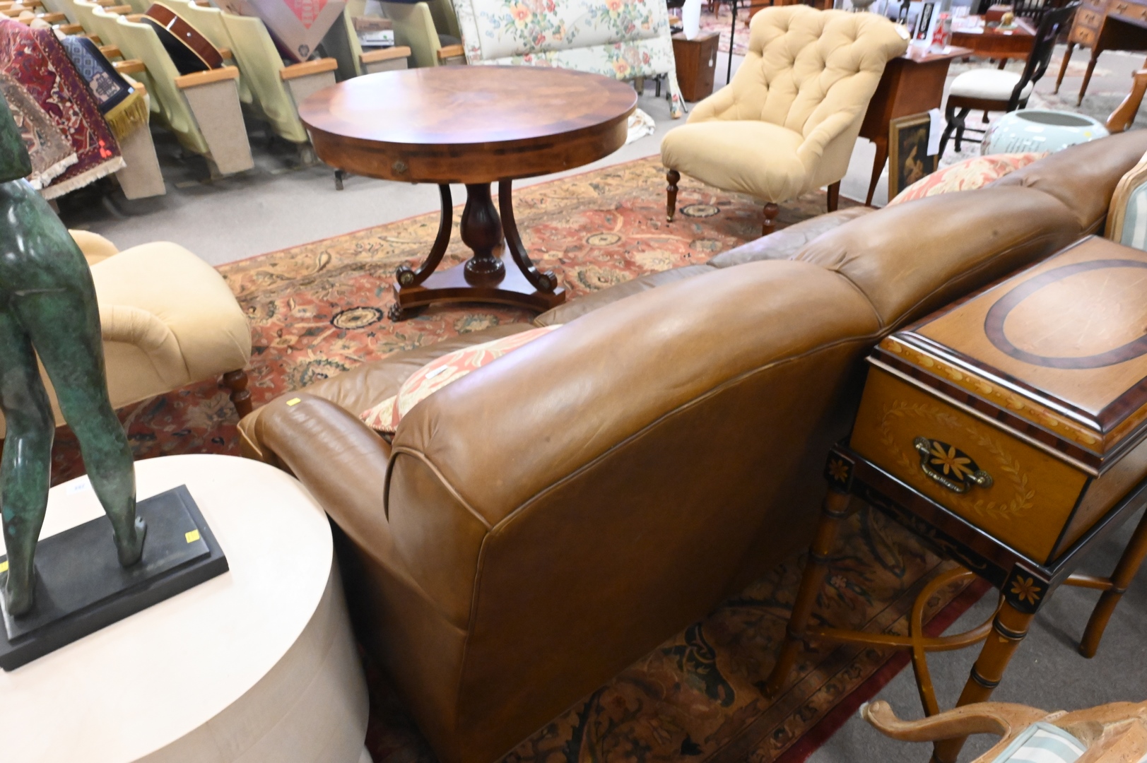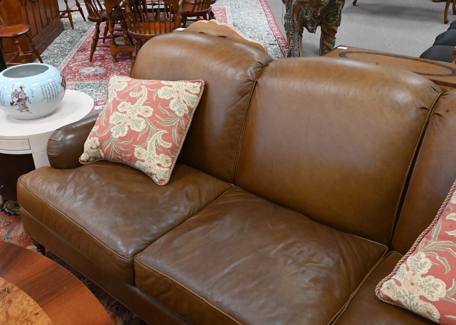 Leather Upholstered Sofa, having three cushions, along with large brass castors, height 35 inches, length 83 inches.