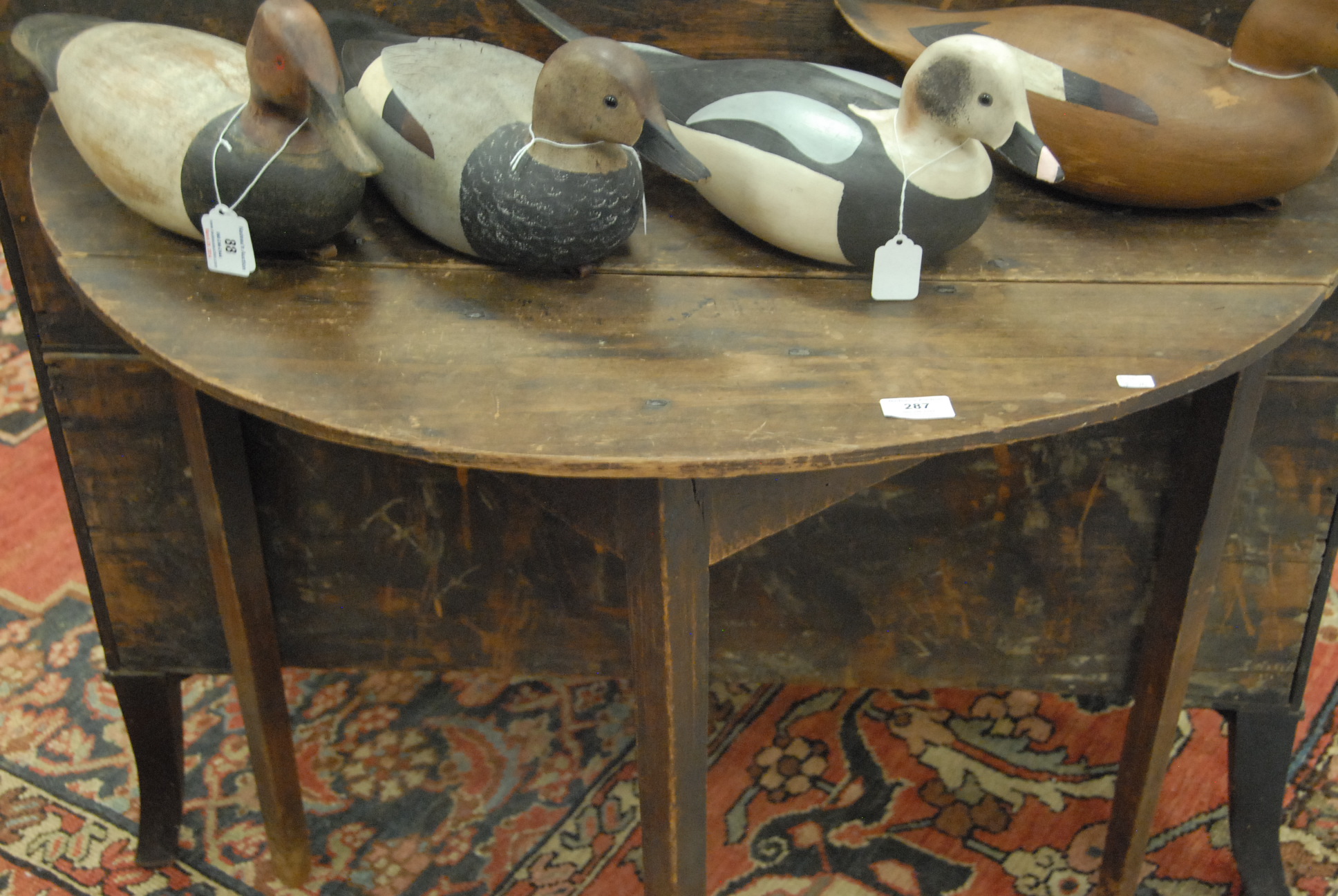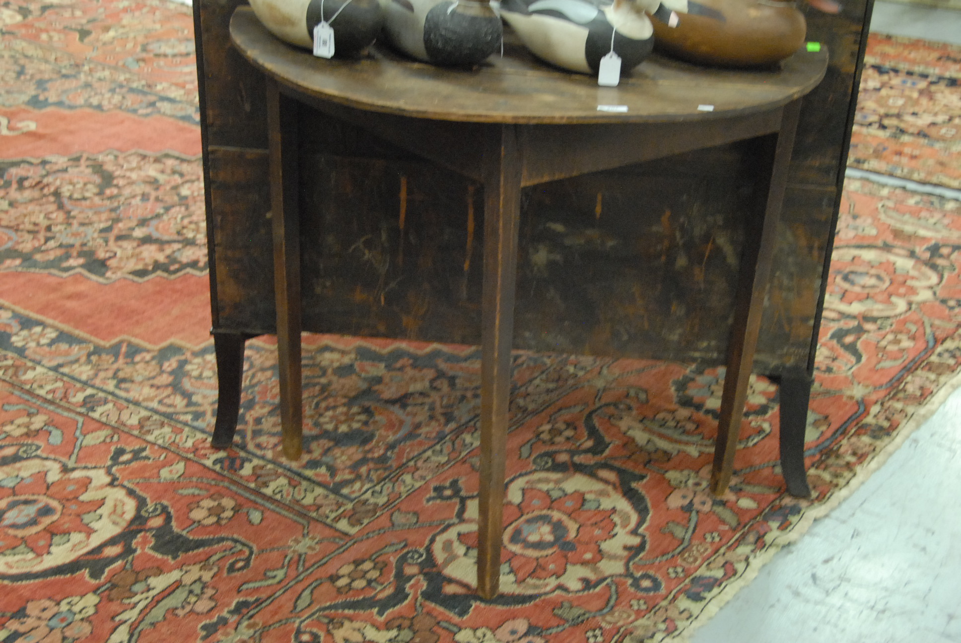 Lot 287: Primitive demilune table on square tapered legs in old surface, no paint. ht. 32in. top: 35 x 17 1/2
