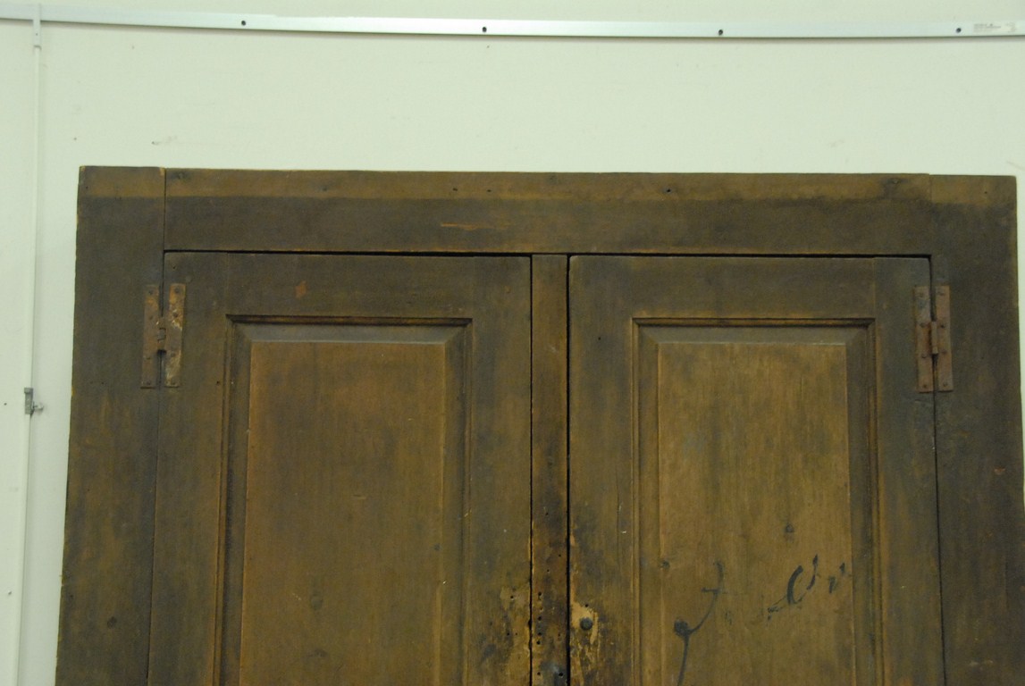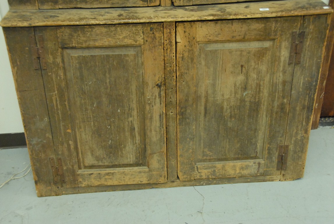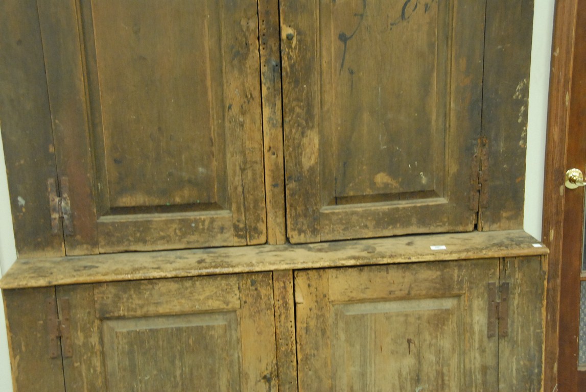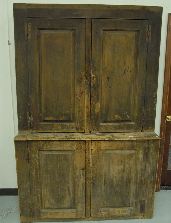 Lot 287: Primitive step-back cupboard having two raised panel doors in upper section over two raised panel doors in base, 18th century in or…