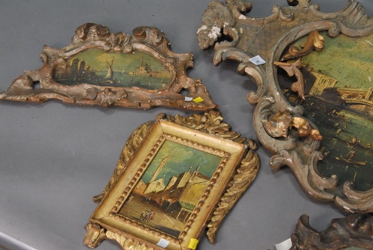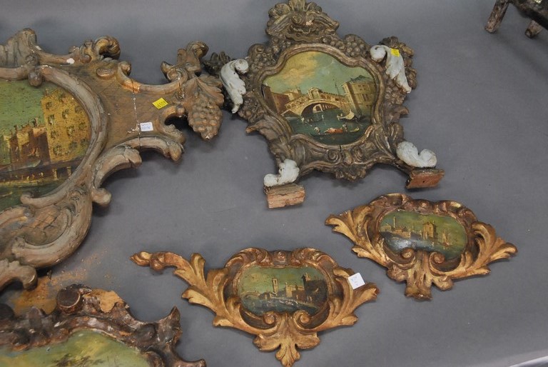 Seven piece lot of Venetian style paintings with elaborate frames. Provenance: property from a home in Rockville Center, New York which was decorated by Iris Apfel. 4 1/2 x 6 to 9 1/2 x 12