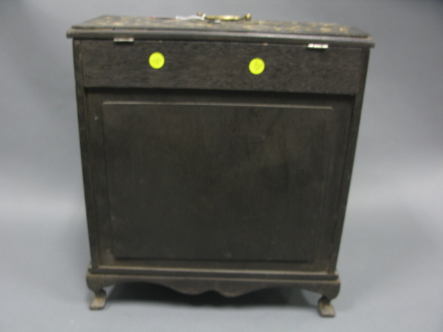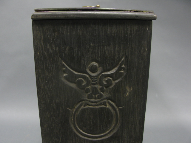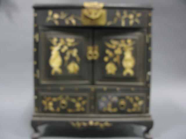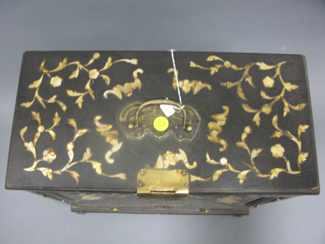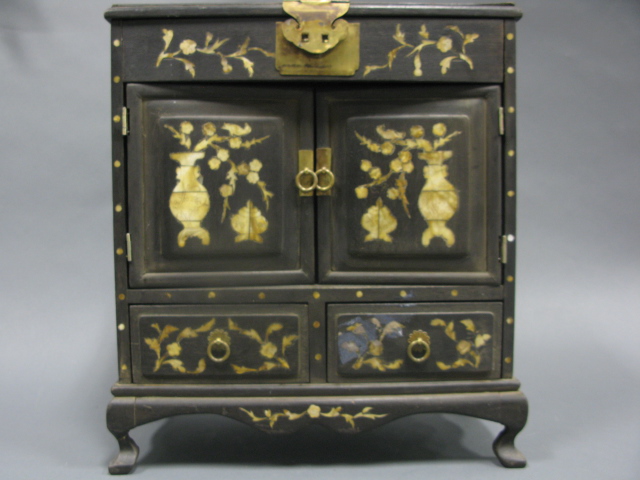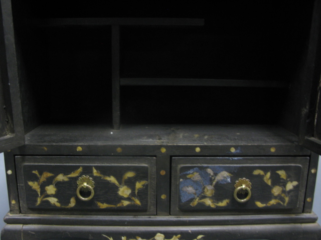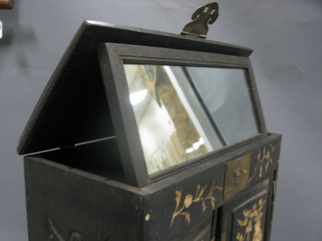 Small carved bat chest with lift top and fold out mirror over two doors over two drawers with inlaid mother of pearl in the form of bats and vines.
