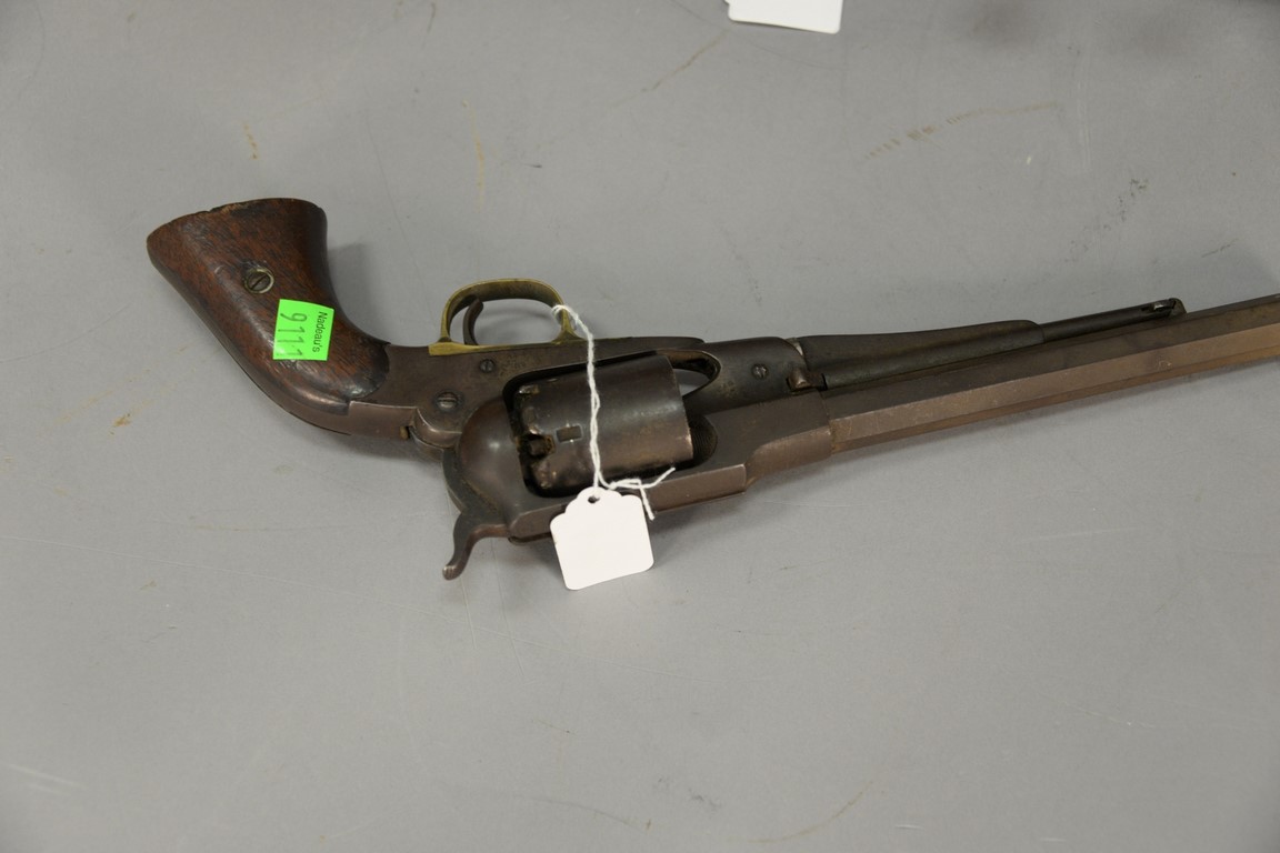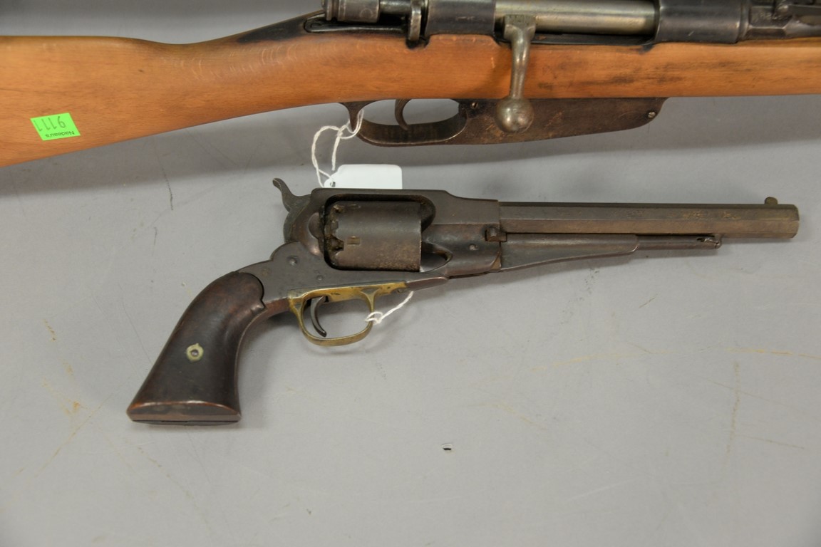 Three piece lot to include W.V. Steiger Thun Swiss Vetterli bolt action rifle 10mm rimfire bullets, vintage 1869 465 a Beretta Gardone V.T. rifle 1932 6.5 Carcano, refinished wood, repair and crack to top of stock, 18 barrel, dark bore with strong rifling sn19729 and Cap & Ball pistol, about 44 cal., 8 barrel, unmarked.