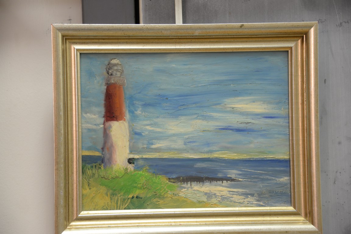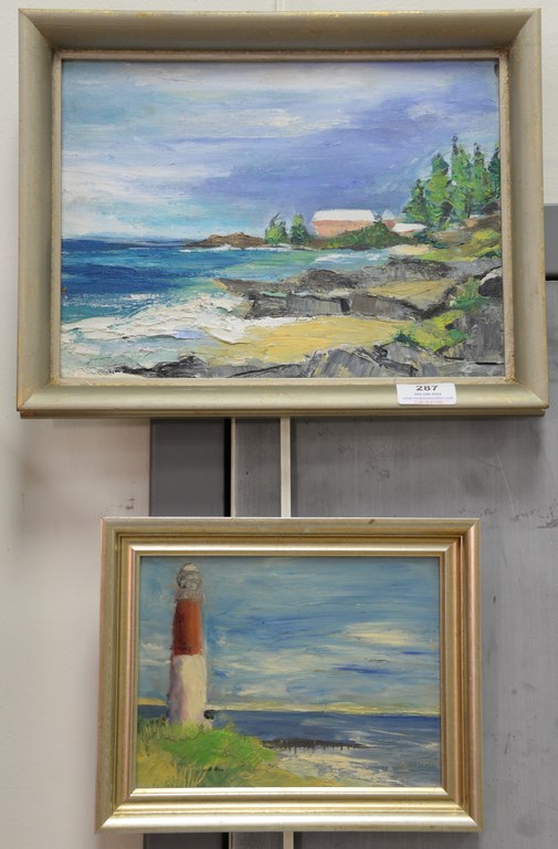 Two paintings attributed to Evelyn Faherty 20th Century including oil on canvas Bermuda written on reverse Evelyn Faherty, 9 x 12 and an oil on board of lighthouse, 6 1/4 x 8 1/4.