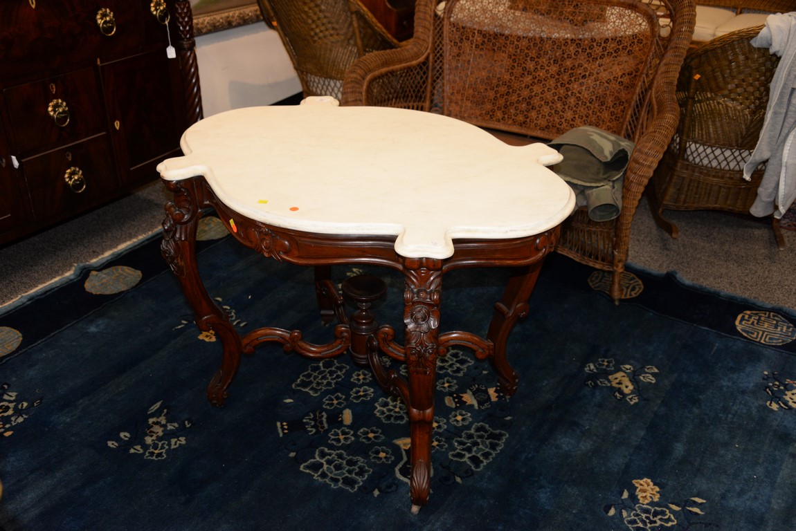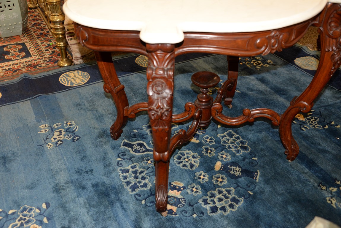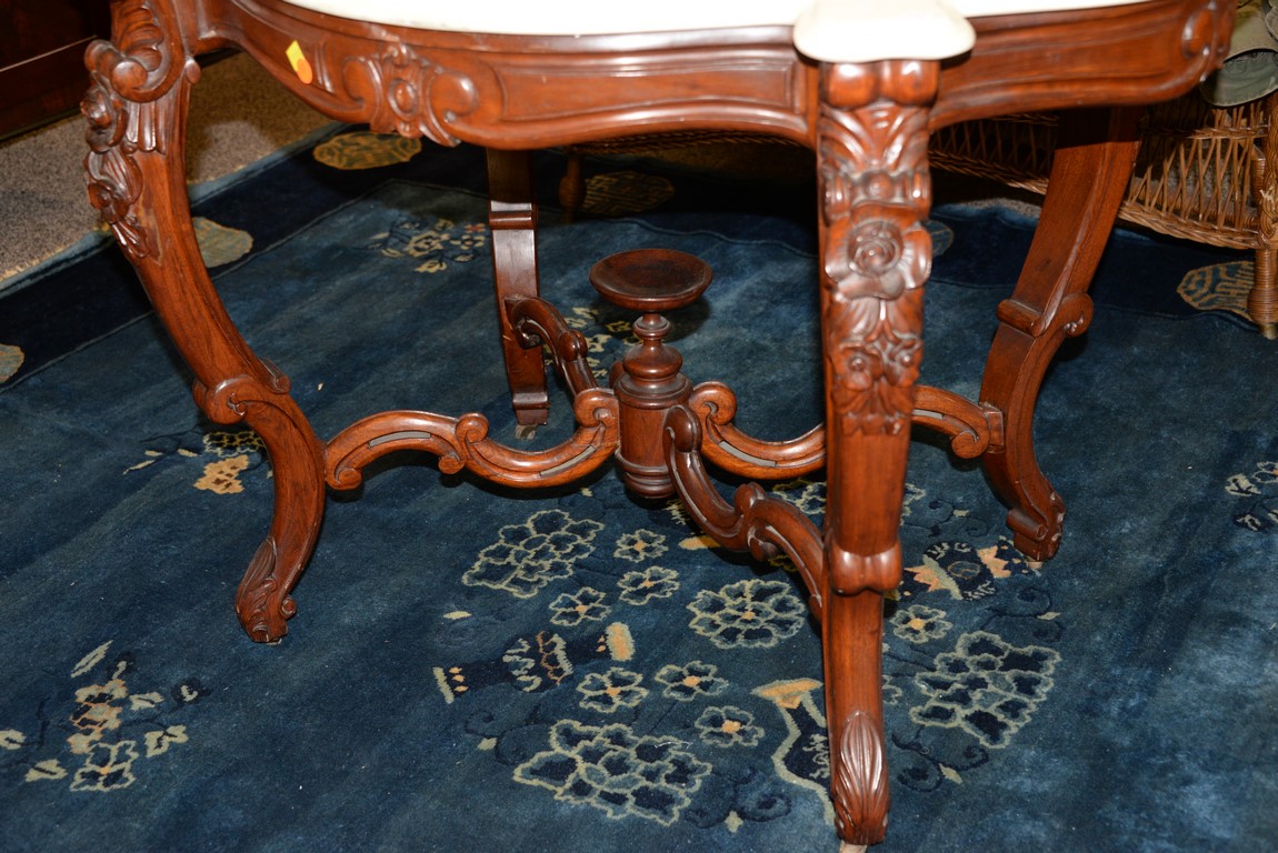 Victorian walnut center table with turtle marble top. ht. 30 1/2 in. top: 29 1/2 x 41 1/2