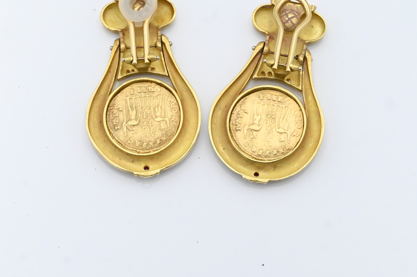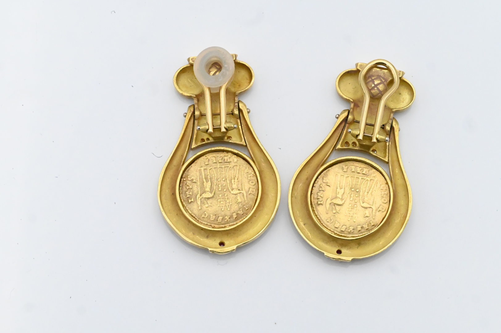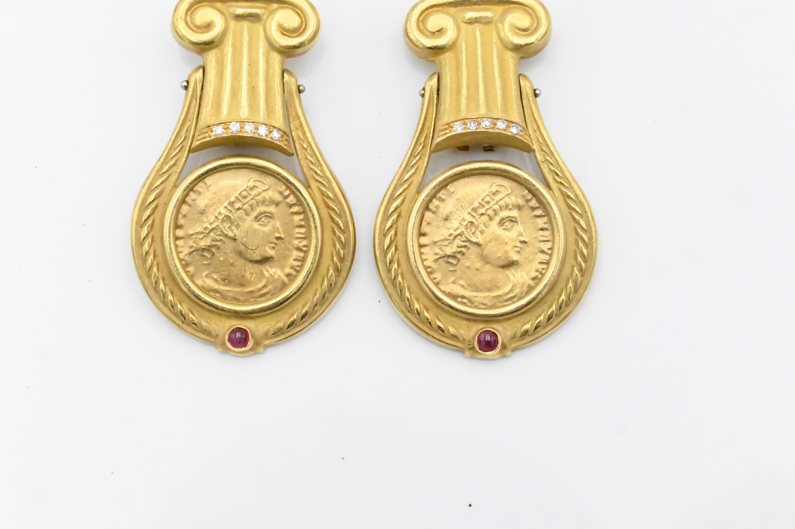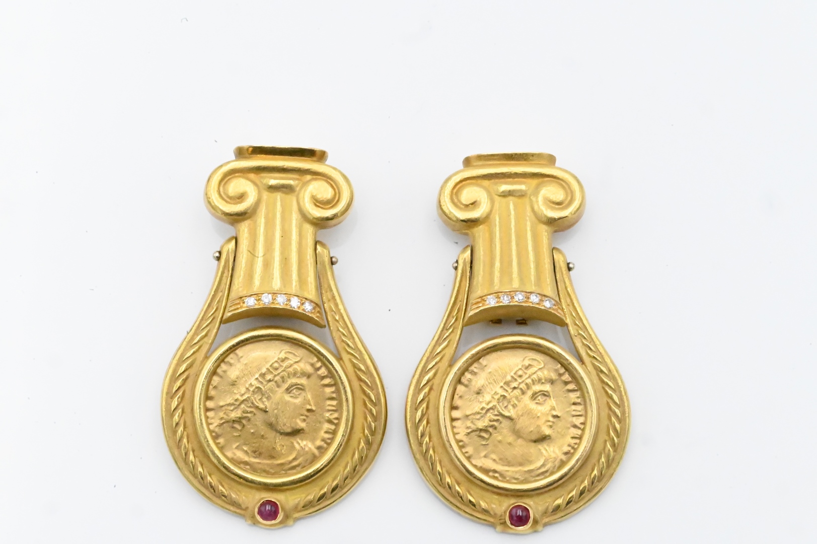 A Pair of 18 Karat Yellow Gold Ear Clips in the form of replica Roman coins with red stone height 1 3/4 inches, 32.3 grams