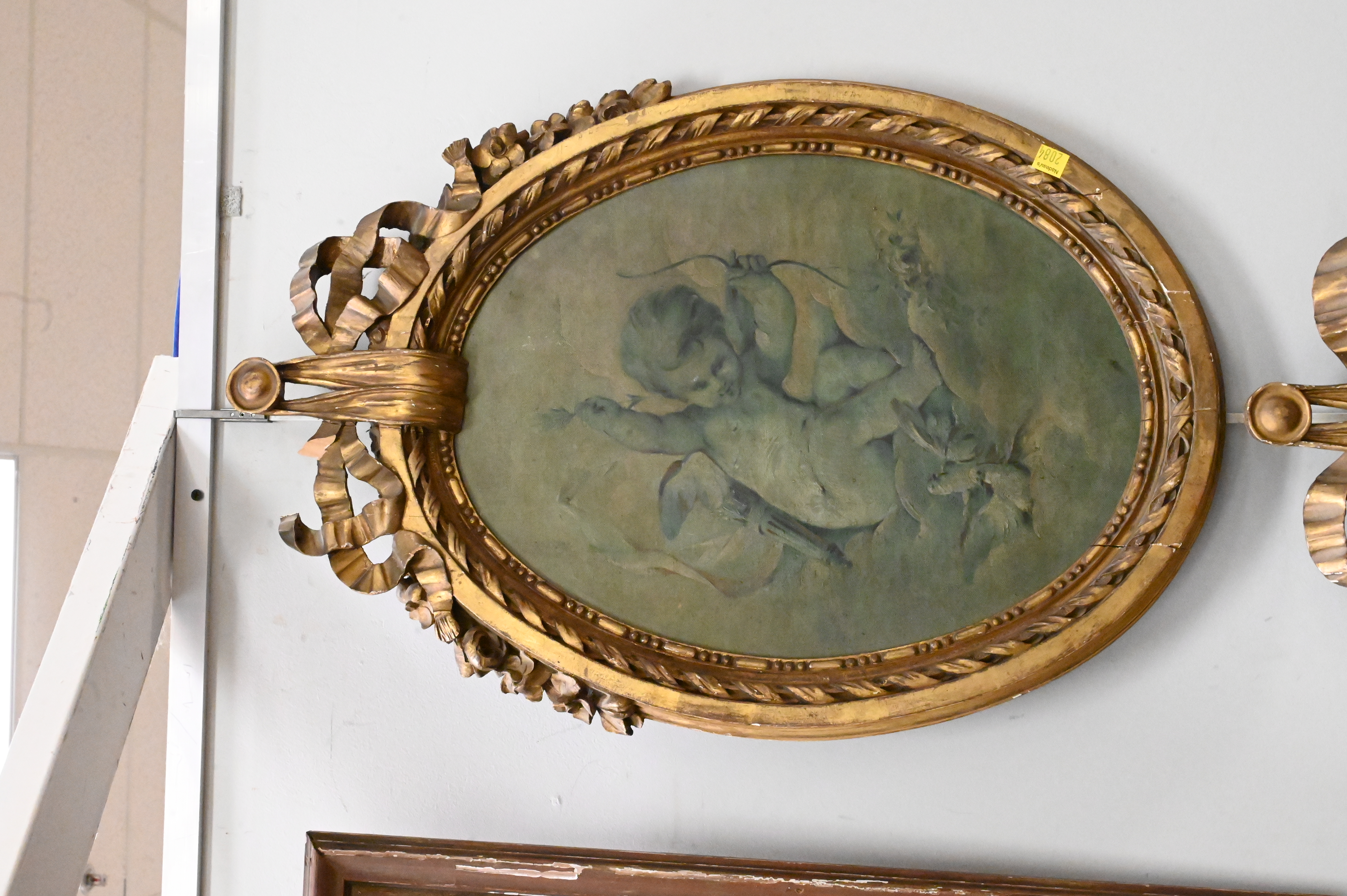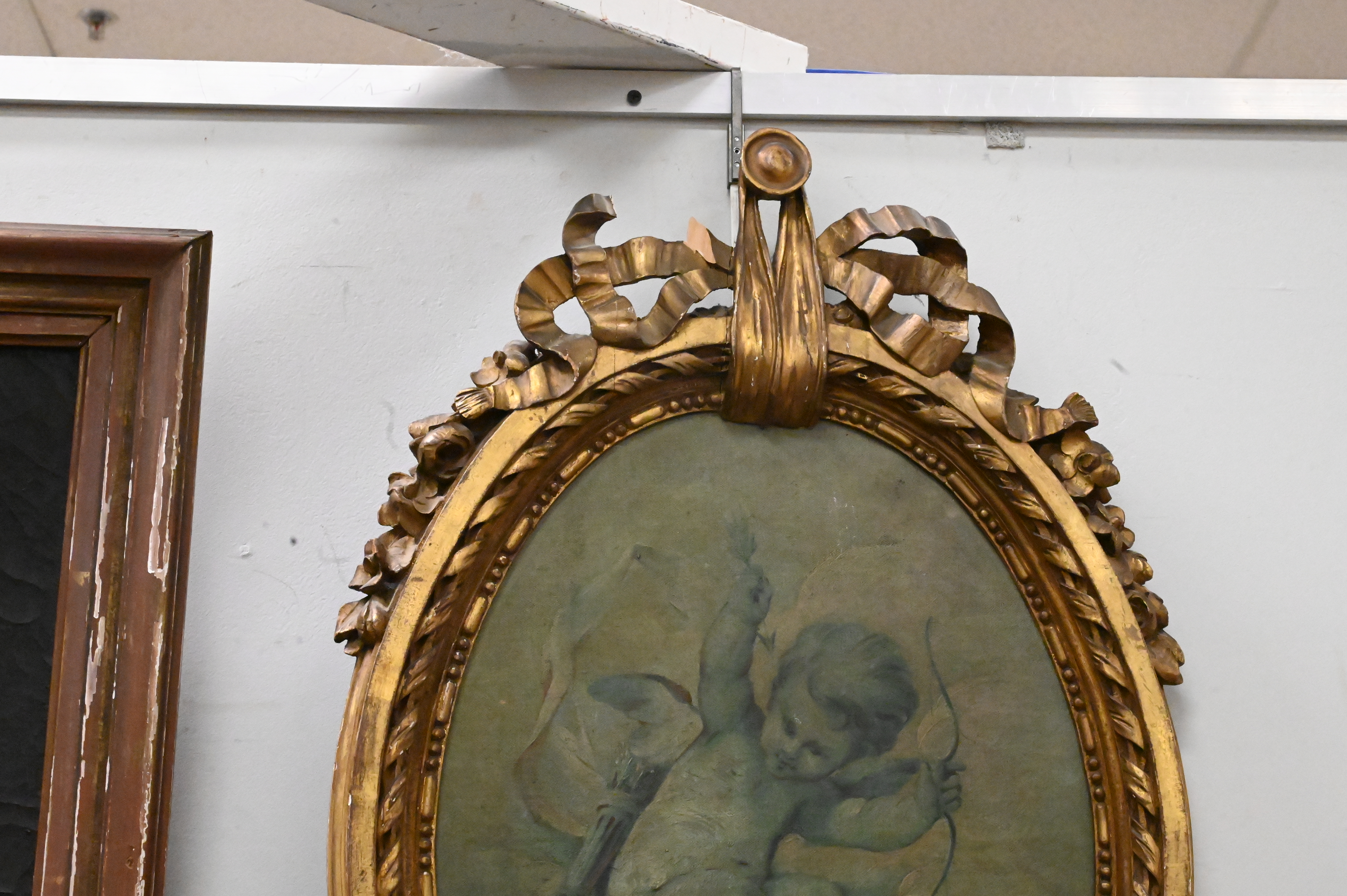 A Pair of 19th Century Continental Oil on Canvas of Putti’s, one depicting cupid with doves, the other depicting a putti fishing, each in oval frames, 18 3/4″ x 14 1/2″.