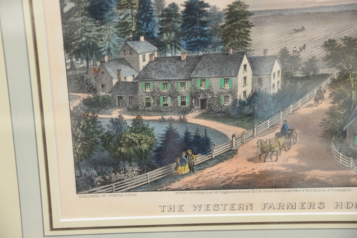 Currier & Ives hand colored lithograph The Western Farmer’s Home, marked lower left: Published by Currier & Ives, entered according to act of Congress in the year 1871 by Currier & Ives, sight size 9 3/4 x 13 1/4. Property from Credit Suisse’s Americana Collection