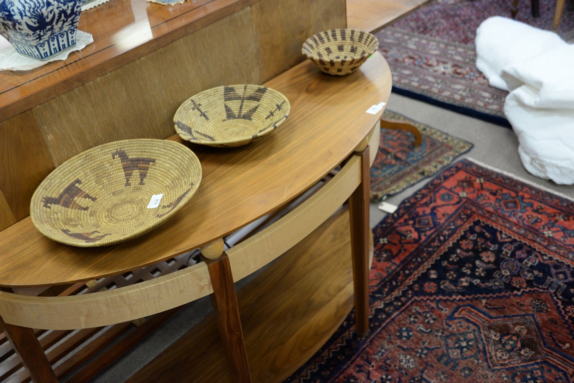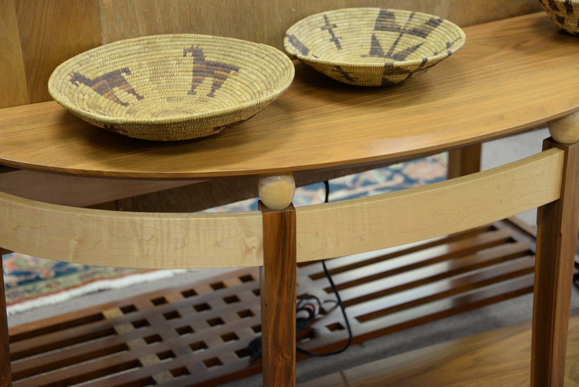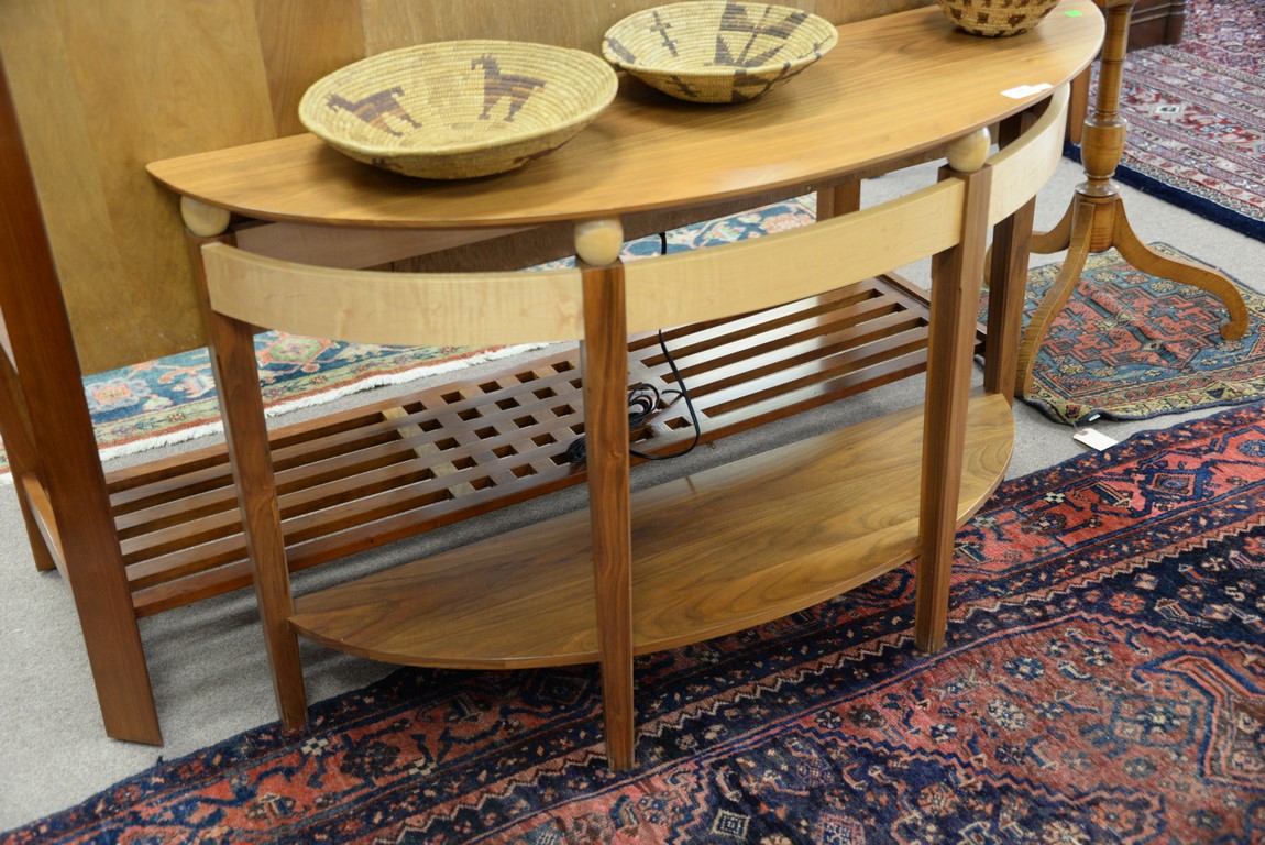 Custom walnut and maple demilune table retail 2,000. ht. 30 in. wd. 48 in. dp. 15 1/2 in.