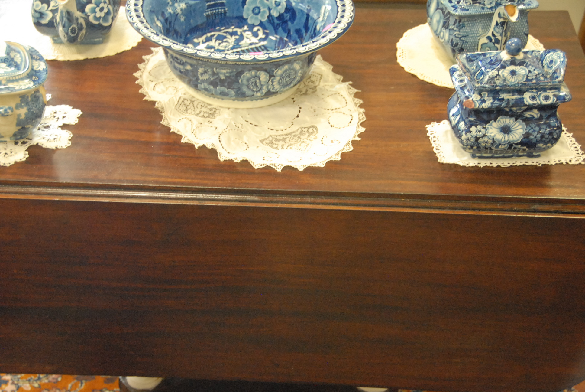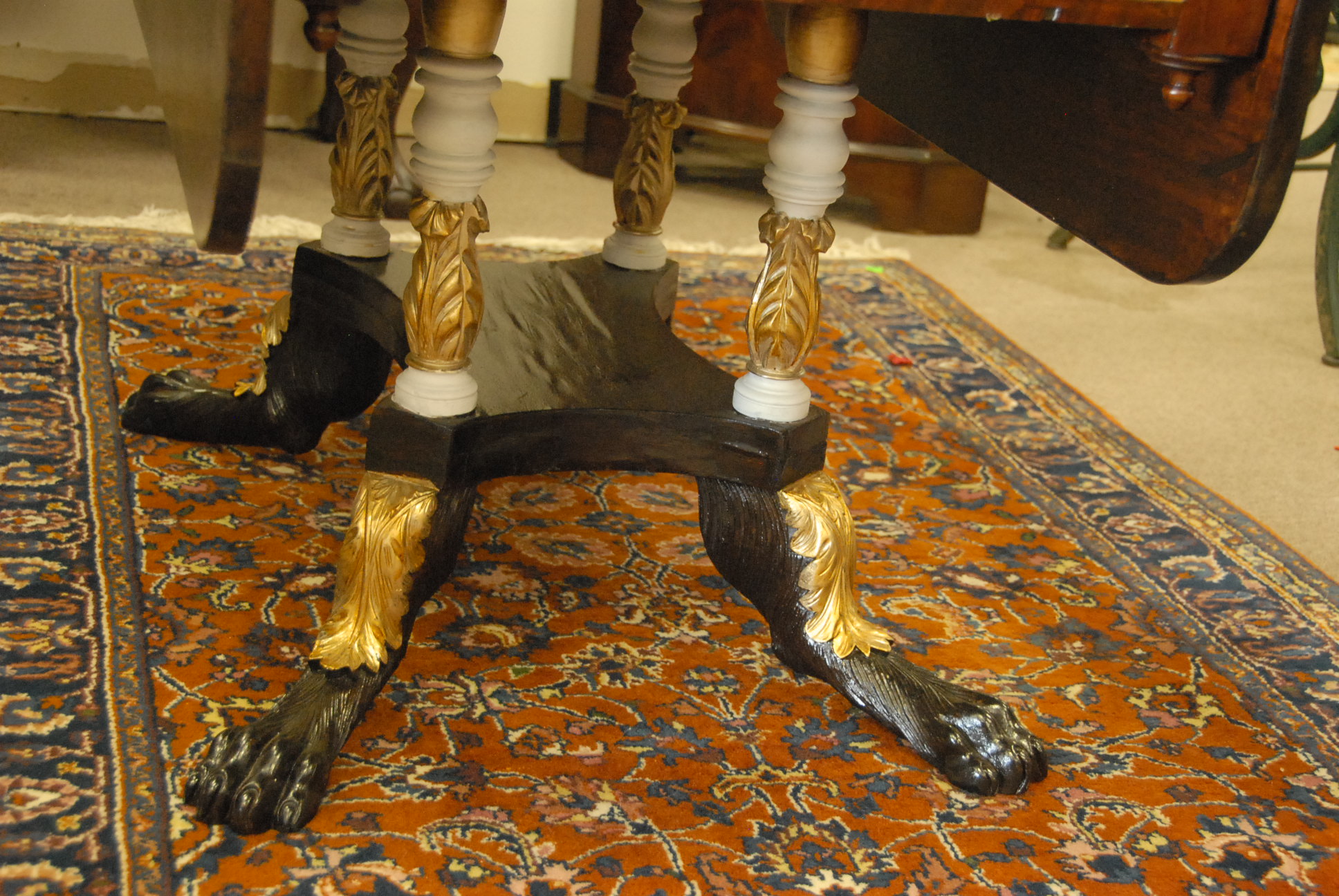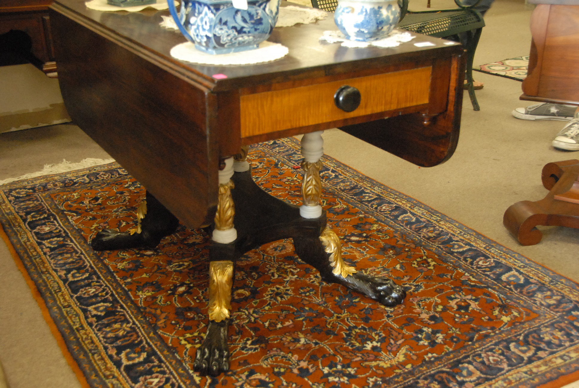 Lot 288: Federal mahogany drop leaf table with carved paw feet and tiger maple drawer front. ht. 27 in. lg. 28 in. wd. 21 1/2 in.