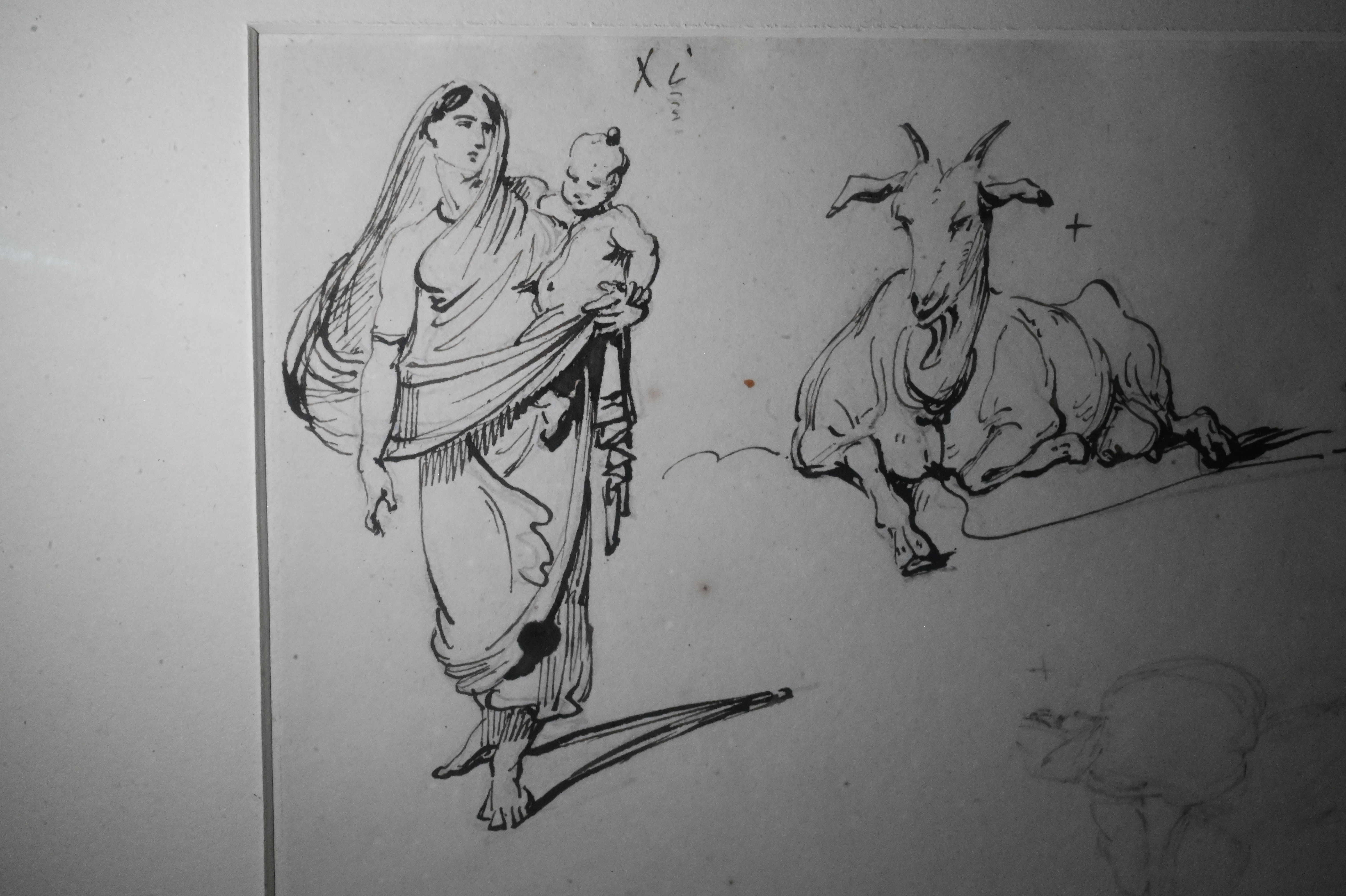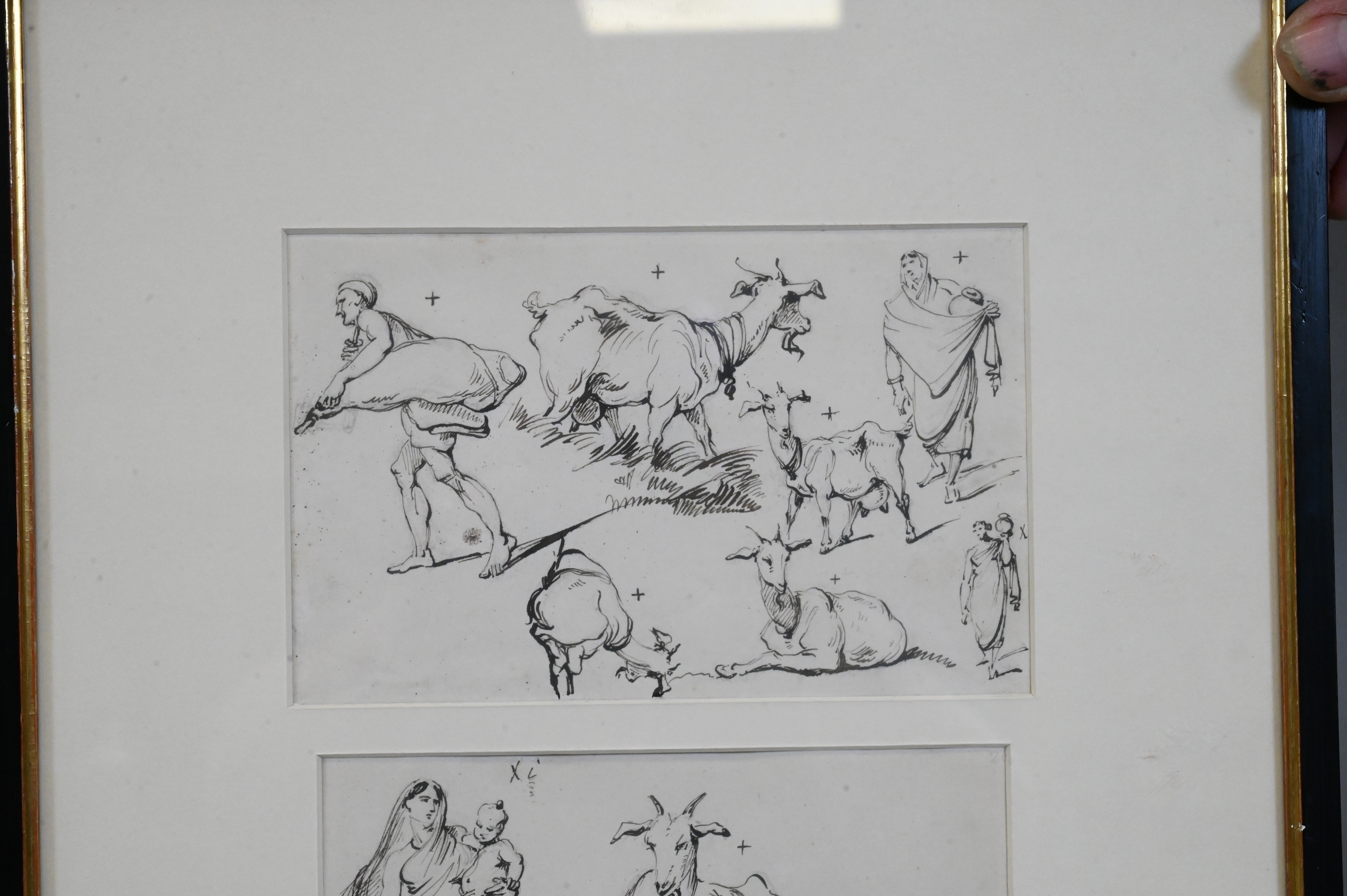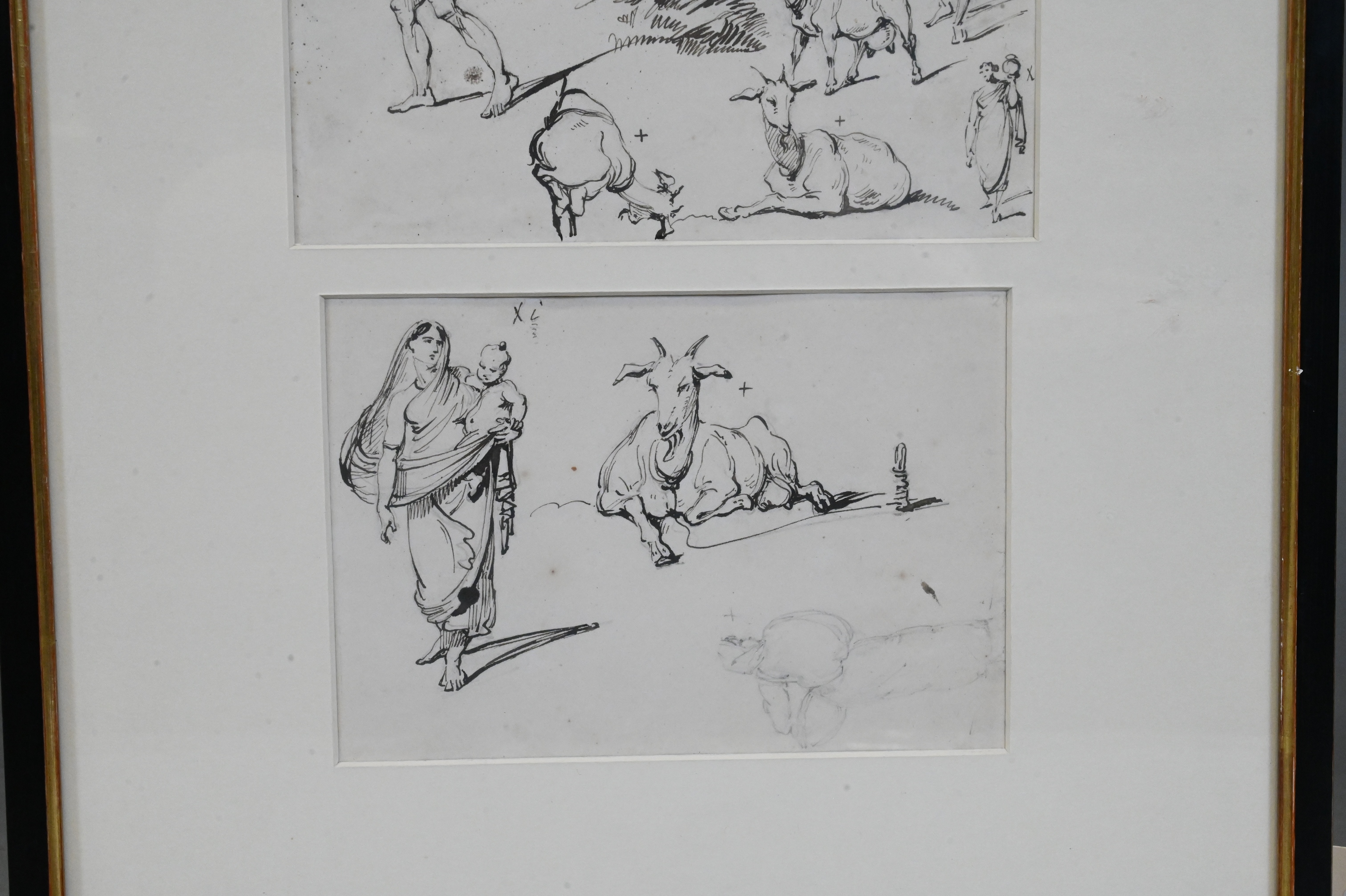two sheets mounted together, comprising lively figure and animal studies executed with Chinnery’s characteristic economy of line, the upper composition depicts a mother carrying her child and a group of goats and herders in motion, the lower shows a seated mother and infant beside a resting goat and a reclining figure; these drawings display the artist’s acute observational skill and his deep engagement with the people and pastoral rhythms of South Asia