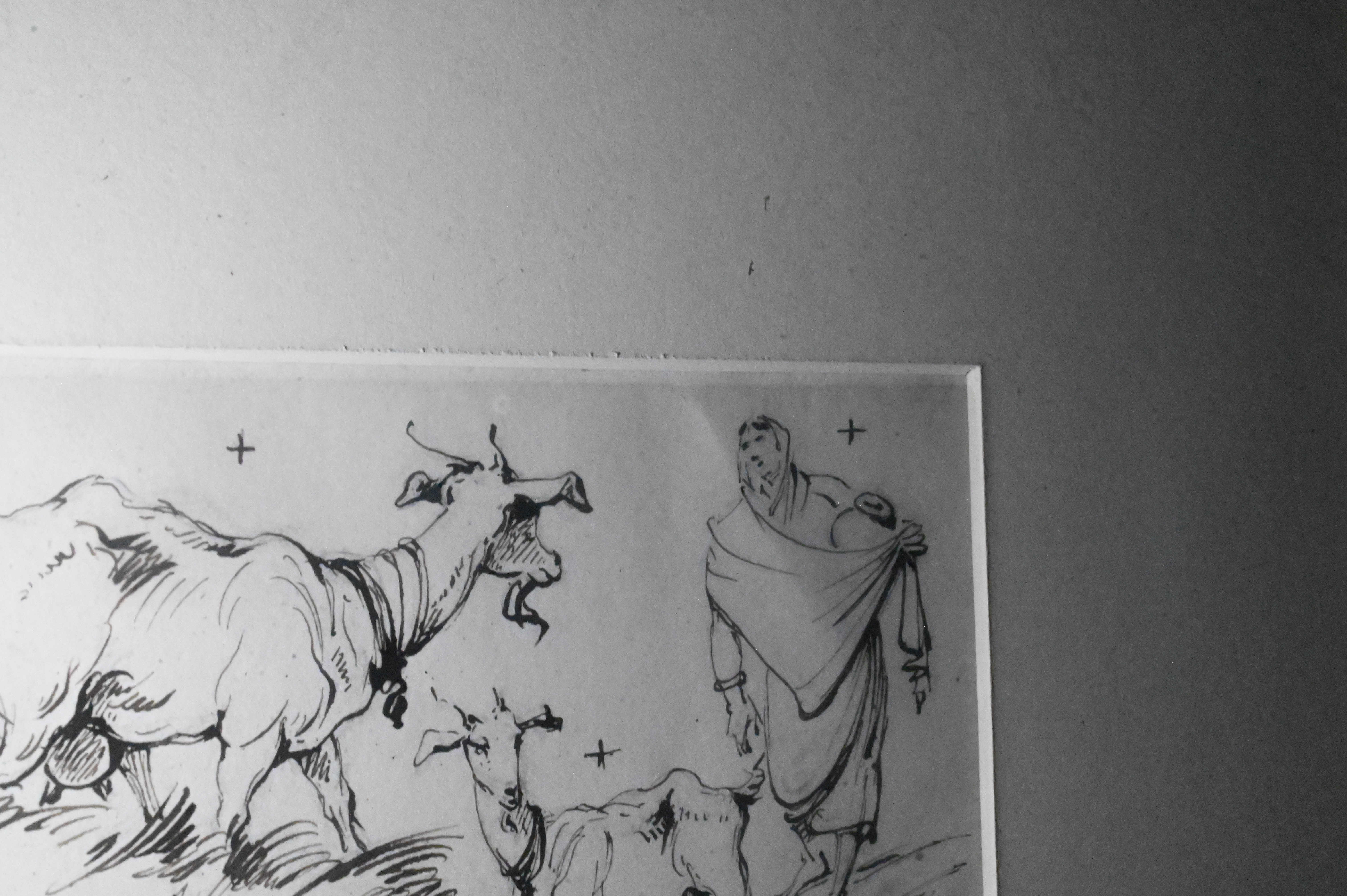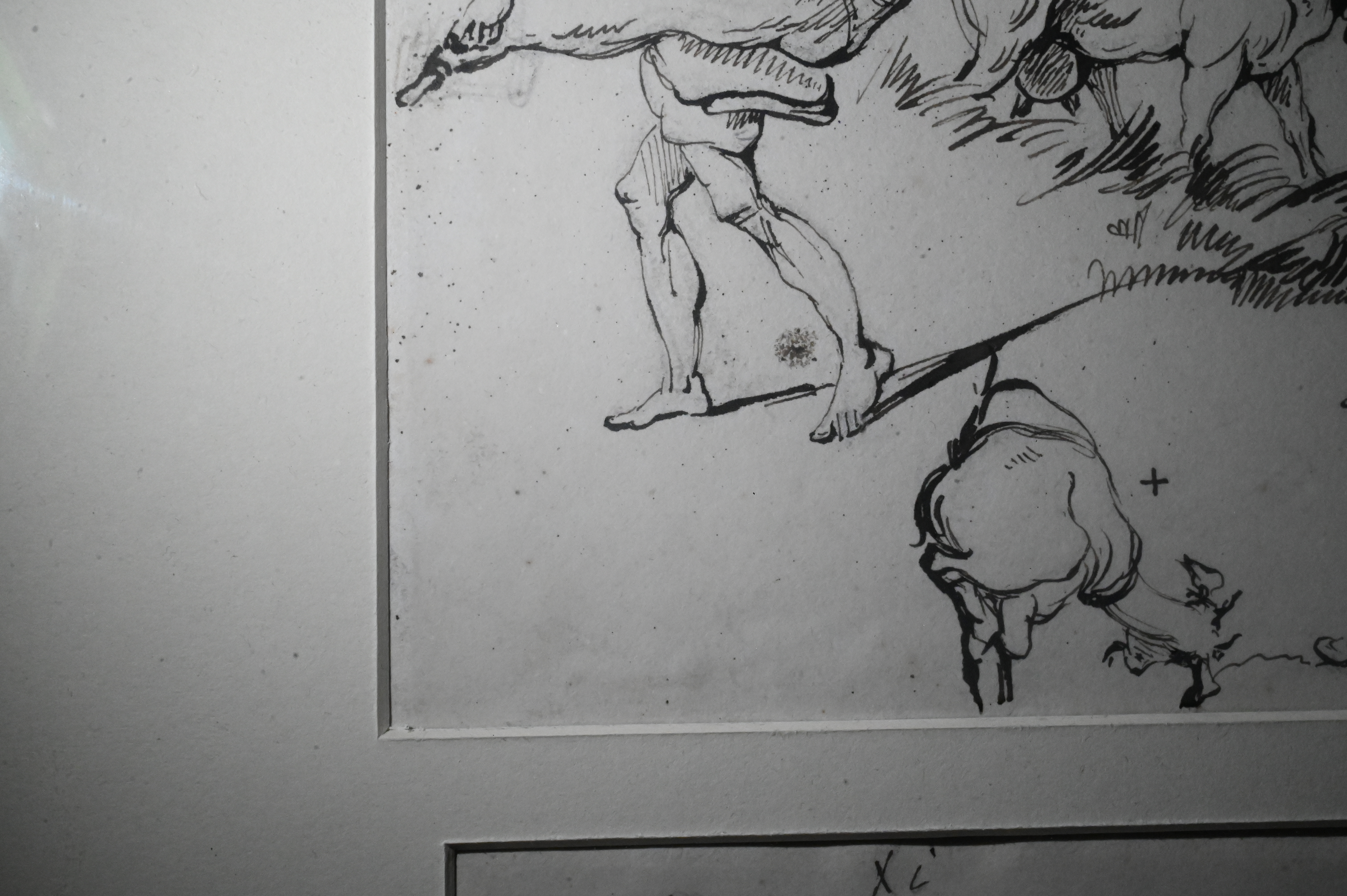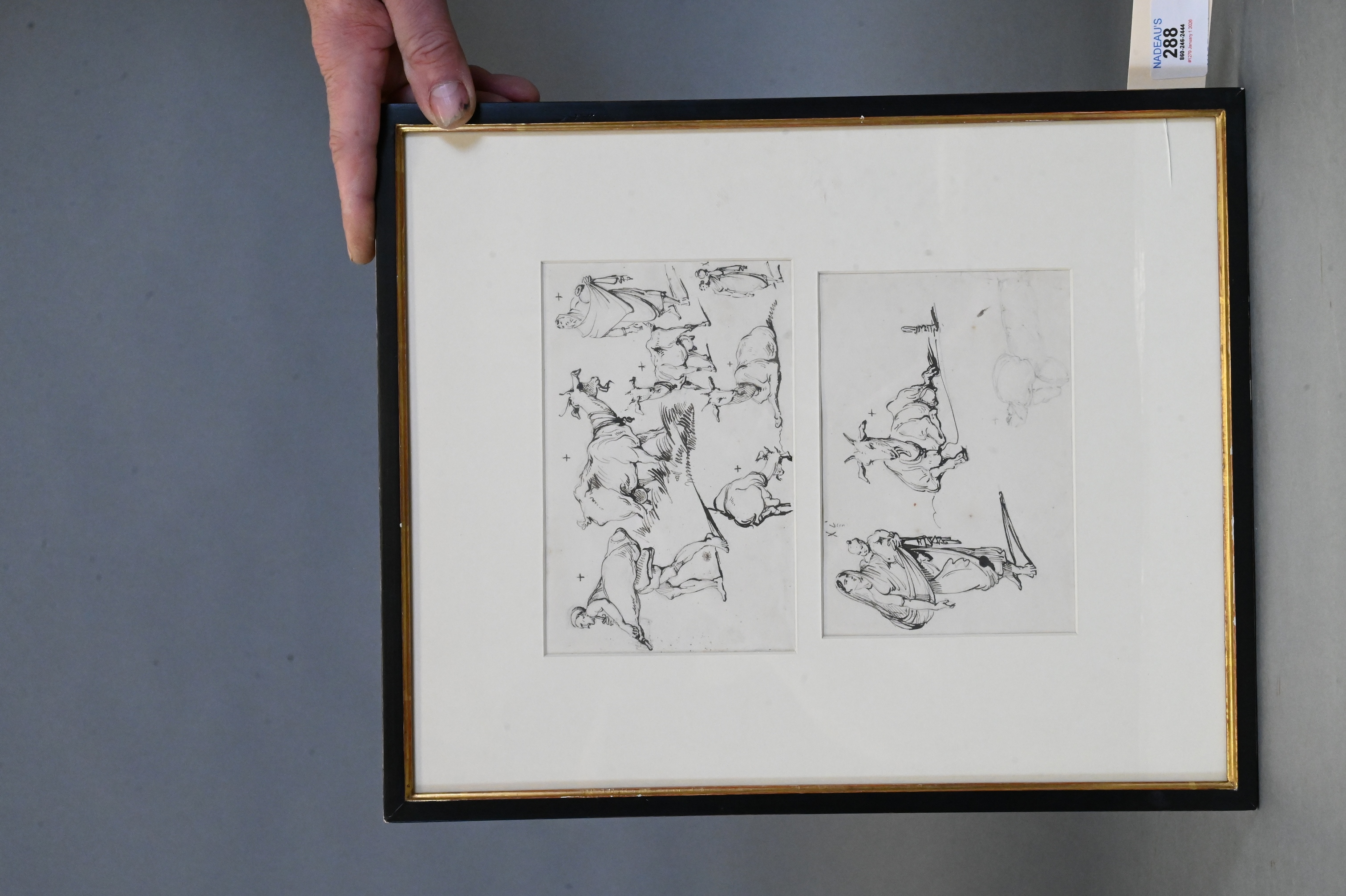 two sheets mounted together, comprising lively figure and animal studies executed with Chinnery’s characteristic economy of line, the upper composition depicts a mother carrying her child and a group of goats and herders in motion, the lower shows a seated mother and infant beside a resting goat and a reclining figure; these drawings display the artist’s acute observational skill and his deep engagement with the people and pastoral rhythms of South Asia