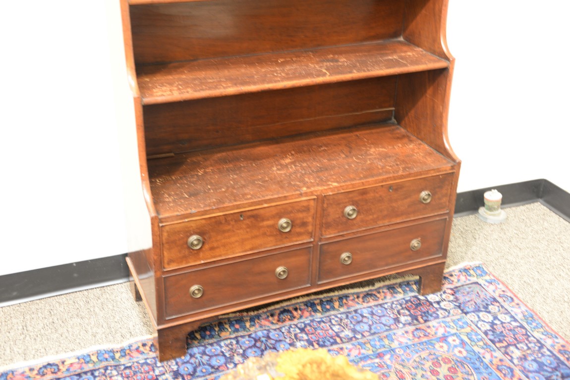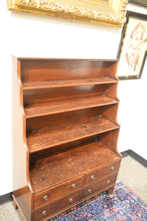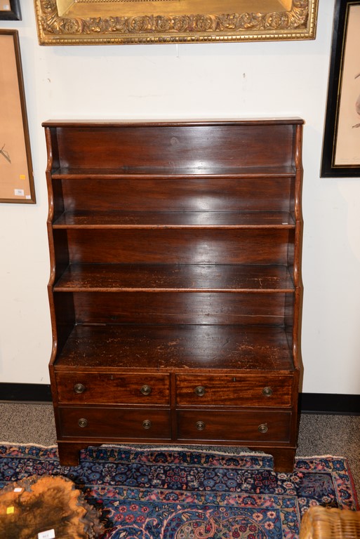 Lot 288: George III mahogany and pine bookshelf with two drawers and two false drawers top right molding missing, scratches on shelves. ht….