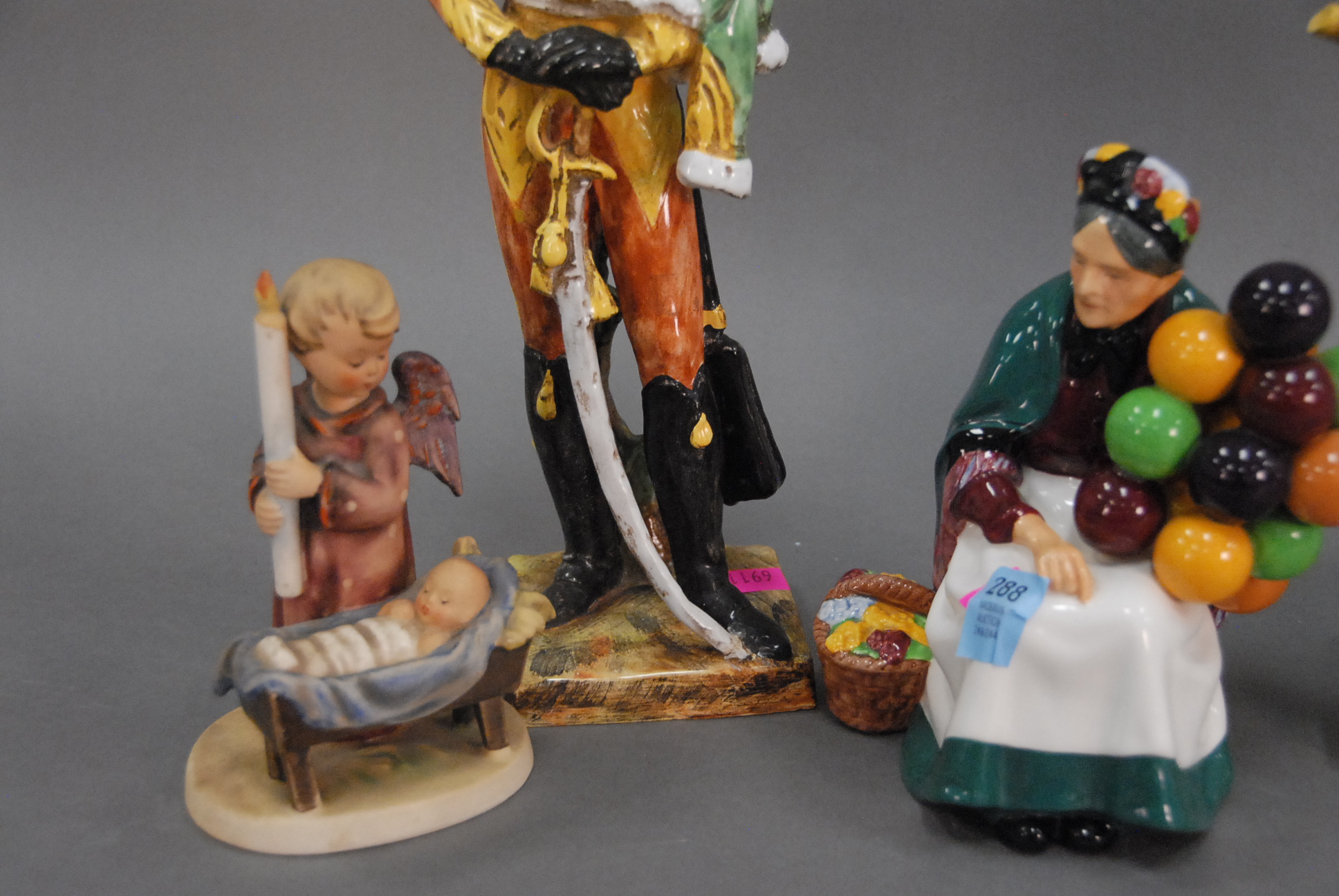 Lot 288: Group lot to include Hummel, Royal Doulton figure, and two Italian Majolica figures decorated by hand Royal Mayolyga.