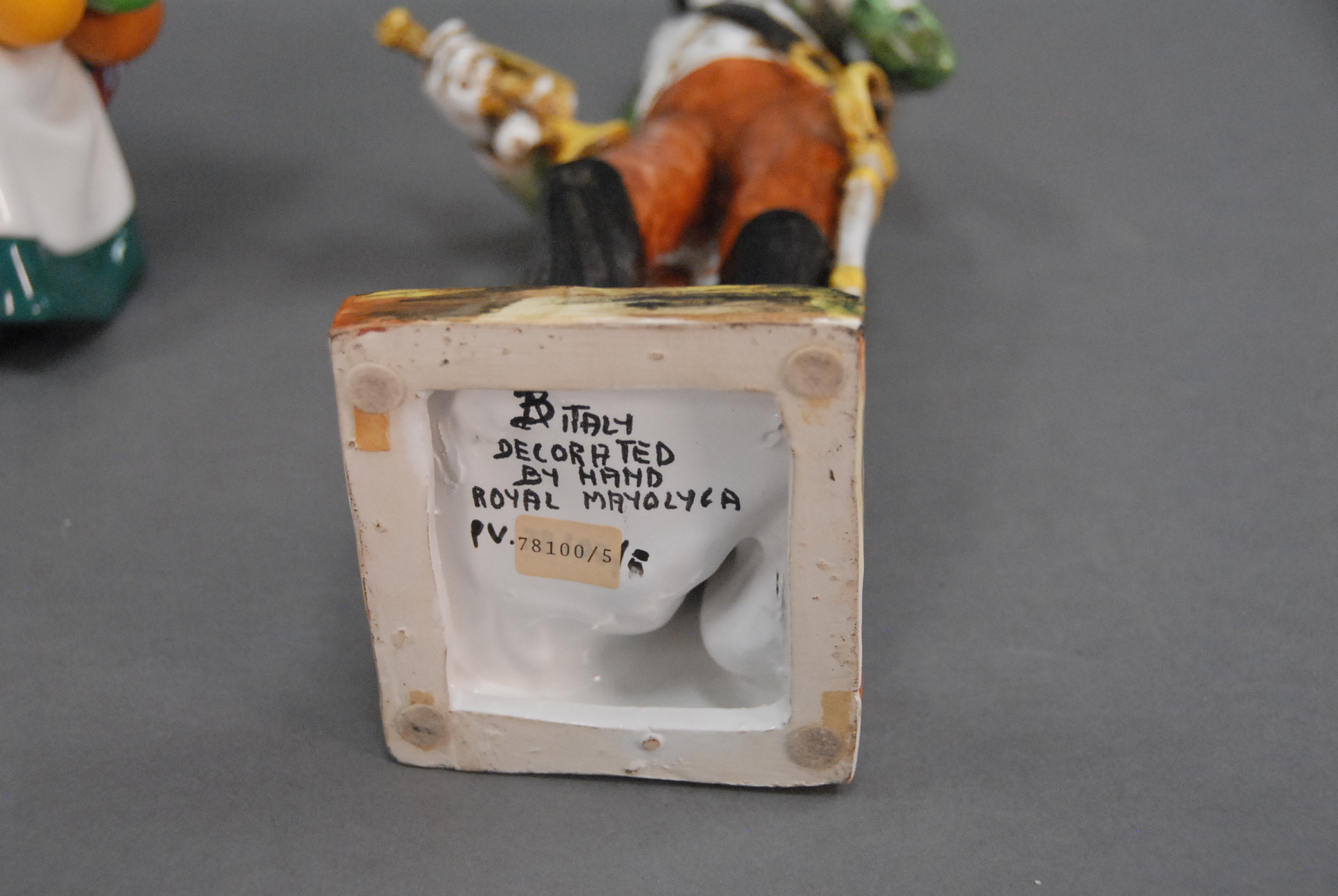 Group lot to include Hummel, Royal Doulton figure, and two Italian Majolica figures decorated by hand Royal Mayolyga.