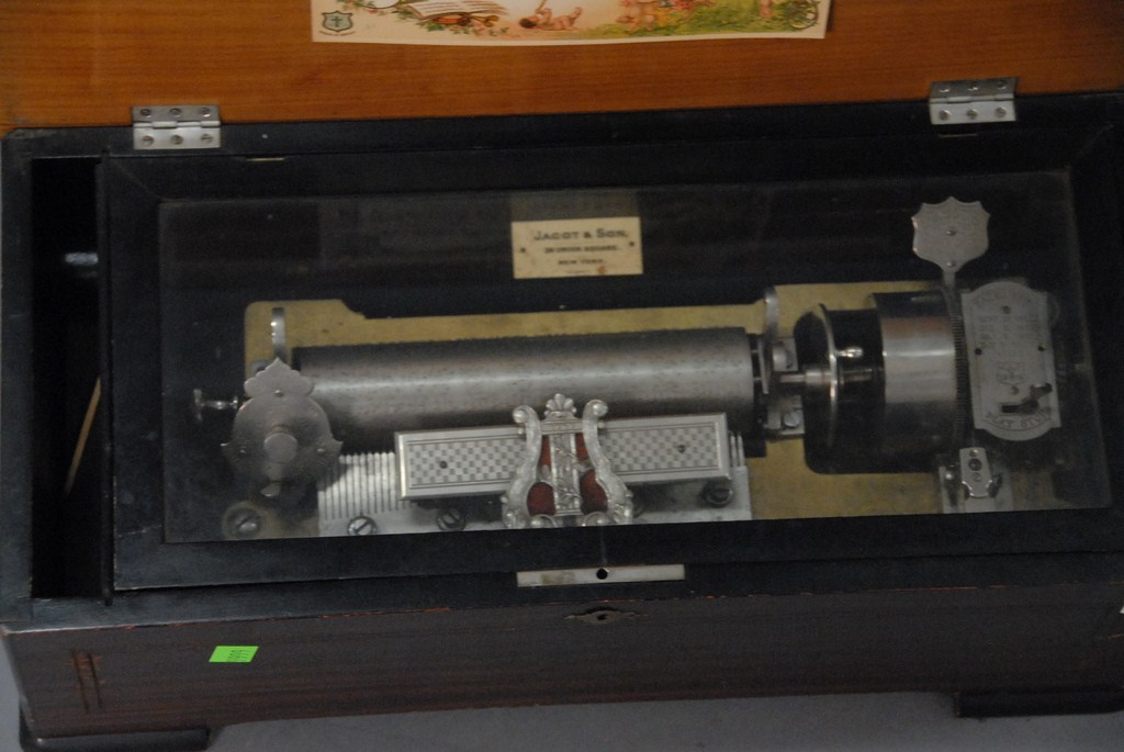 Lot 288: Jacot and Son inlaid cylinder music box having three cylinders, late 19th century in working condition.