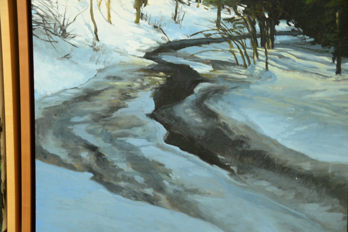 Lot 288: Jay Brooks 20th century oil on board Winter Stream Landscape, signed on verso J. Brooks 99′, framed by Hand Made Frames. 30 x 22…