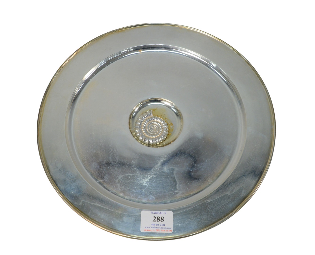 Lot 288: Jocelyn Burton Sterling Silver Service plate having applied shell center, marked on bottom diameter 12 inches 34.7 troy ounces…