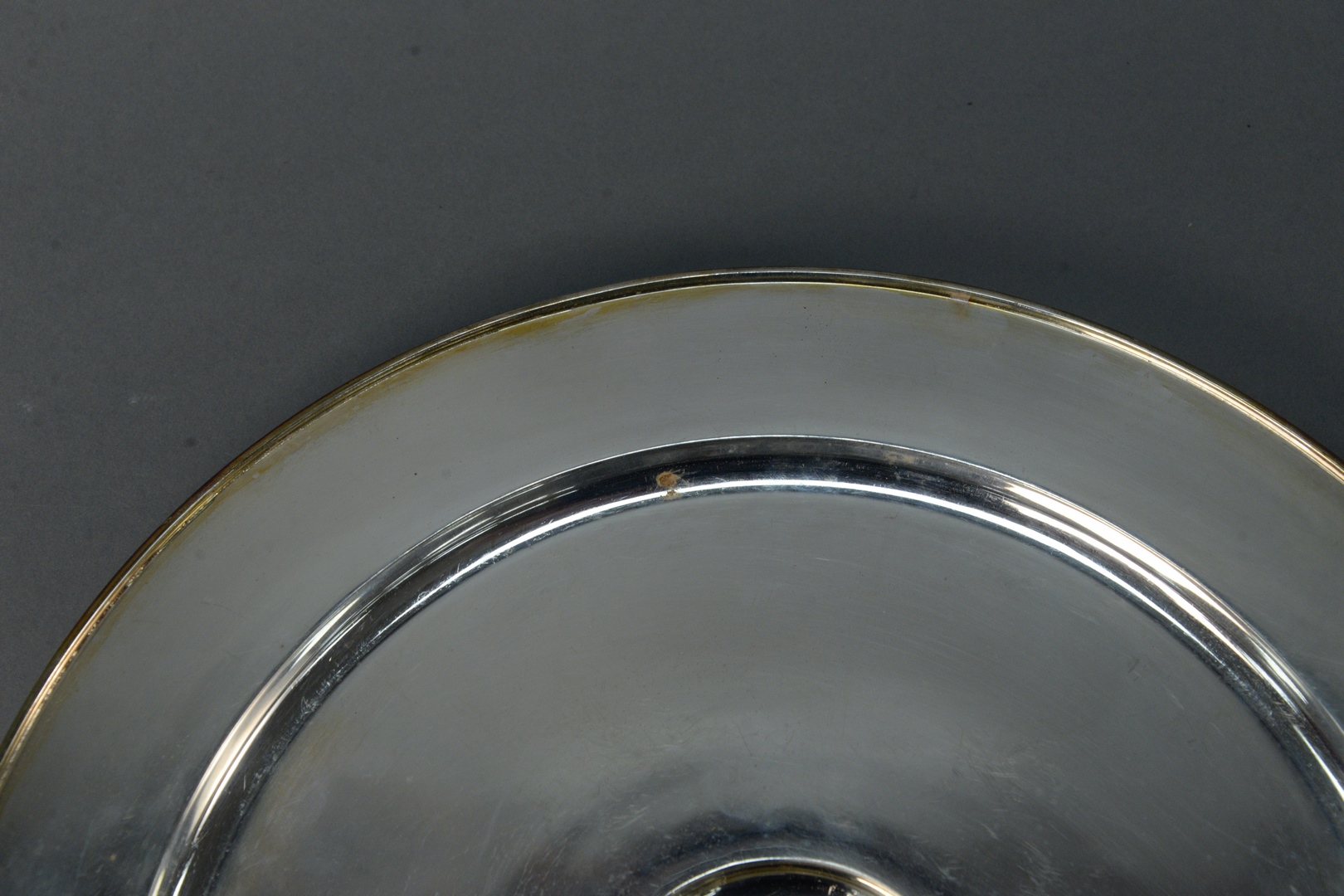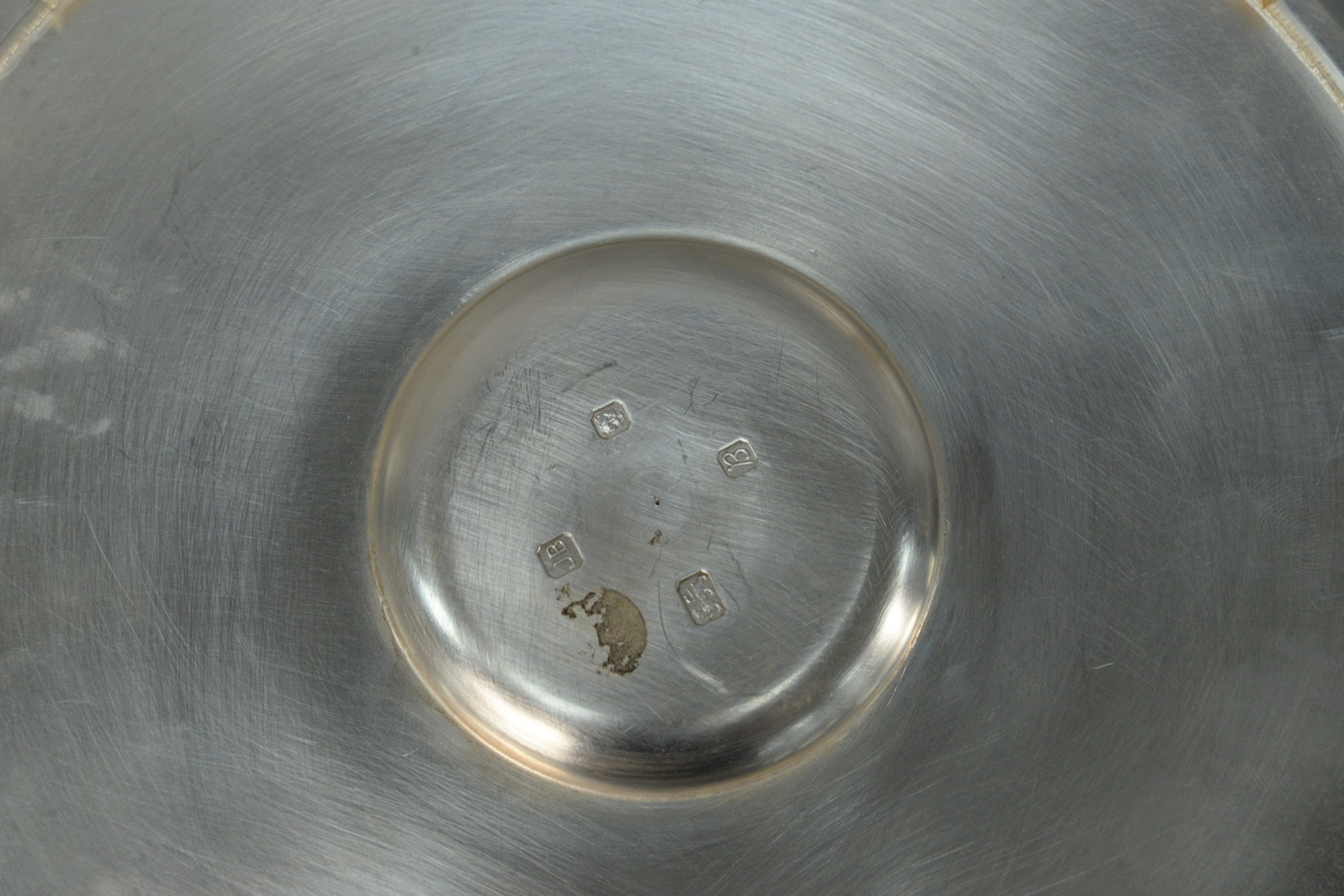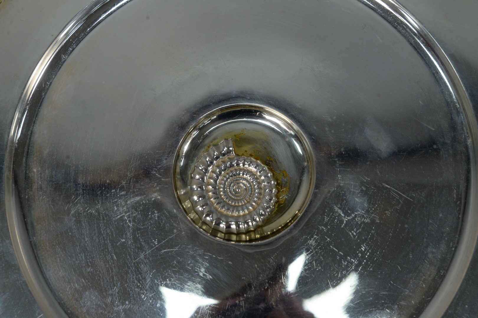 Jocelyn Burton Sterling Silver Service plate having applied shell center, marked on bottom diameter 12 inches 34.7 troy ounces. Provenance: The consignor’s late husband, Philip Refson, owned the Charles de Temple jewelry shop on Jermyn St, London in the late 1970’s through early 90’s. Charles de Temple and Jocelyn Burton were friends, and he carried many of Jocelyn’s silver pieces in his store. Mr. Refson became a private client and personal friend of Jocelyn’s during this time and often commissioned pieces directly from Jocelyn. The chargers and the bull place card holders Philip was a Taurus are examples of commissioned pieces.