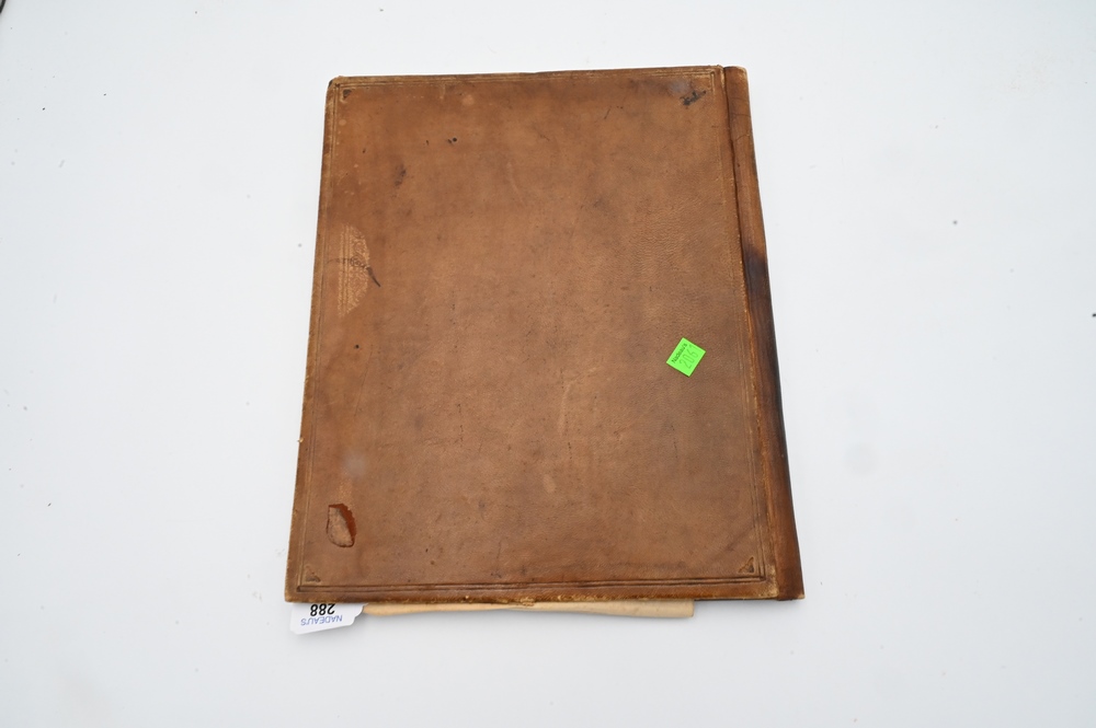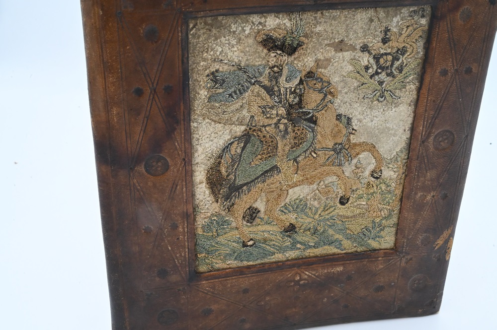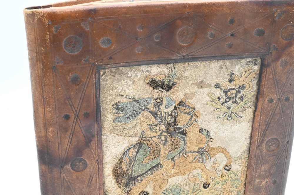 Lot 288: Leather Folio Binder, having leather insert, embroidered with Chinese figure on horseback, 11 1/2″ x 14 1/4″.