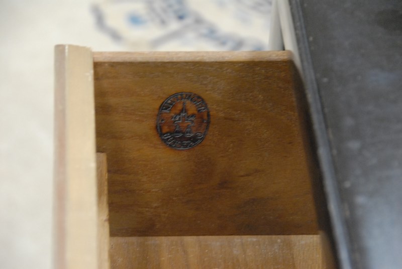 Lot 288: Pair of Kittinger Mid-Century dressers solid brass ring pulls, stamped Kittinger, solid structurally tops could use a refinish, ht….