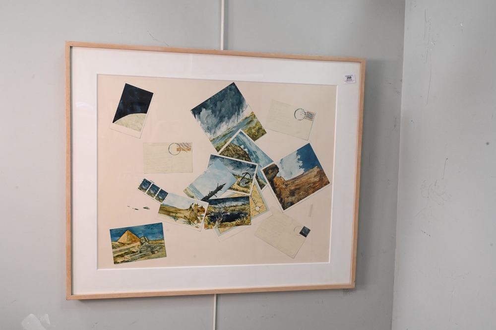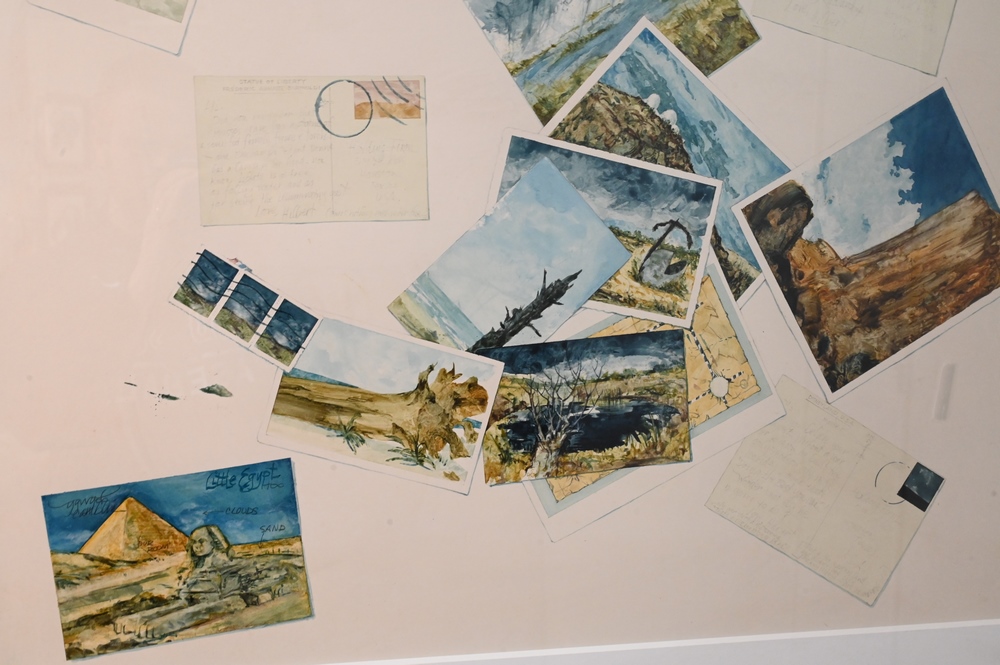 Lot 288: Robert Camblin, (American, 1928-2010), Little Egypt Postcards, 1974/ Trompe l’oeil style painted postcards from Disney, Statue of Liberty, and Texas, watercolor, signed, frame size 33″ x 39″ x 2″; paper size 23″ x 29″.