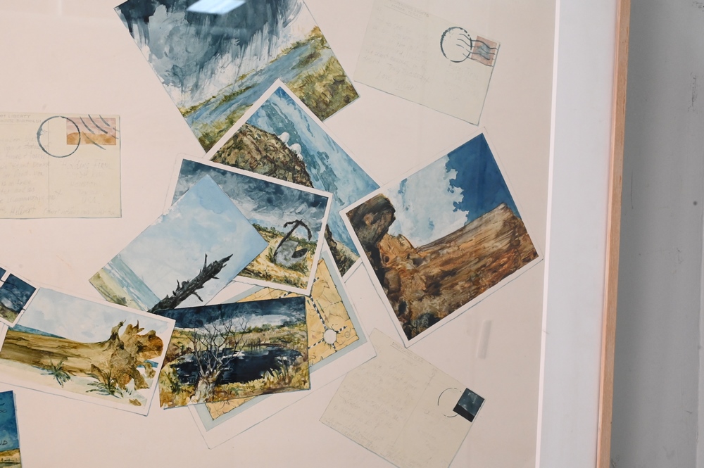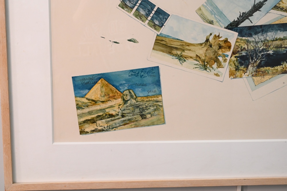 Robert Camblin, (American, 1928-2010), Little Egypt Postcards, 1974/ Trompe l’oeil style painted postcards from Disney, Statue of Liberty, and Texas, watercolor, signed, frame size 33″ x 39″ x 2″; paper size 23″ x 29″.