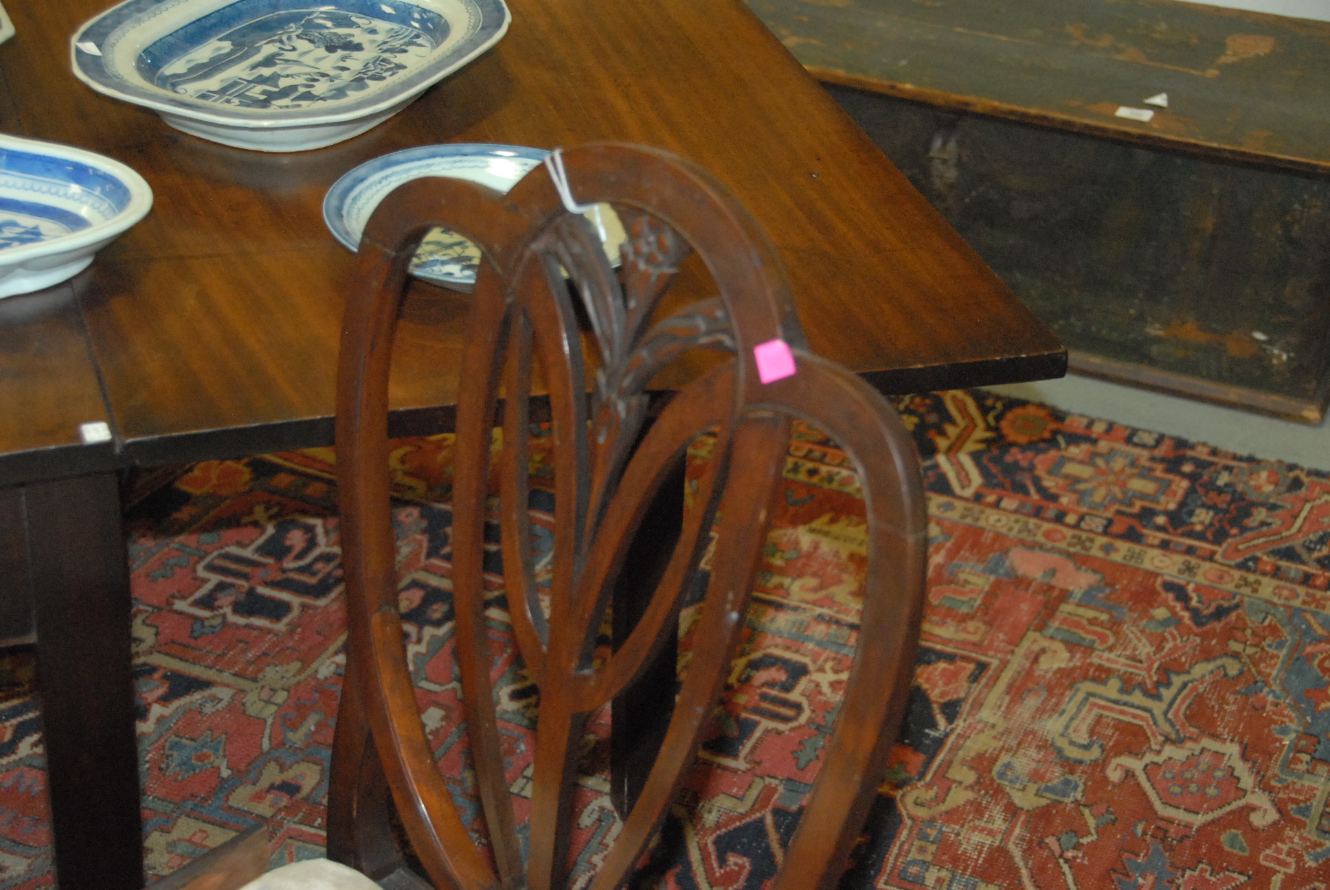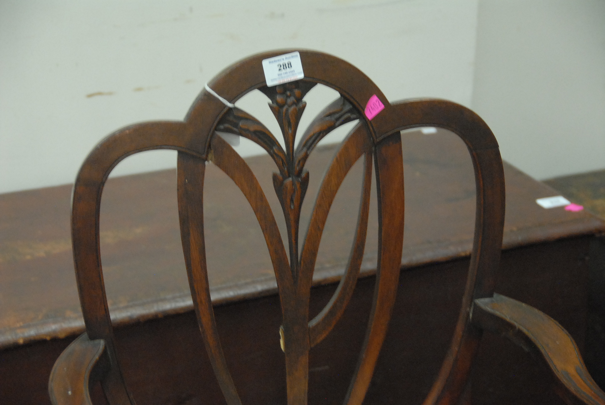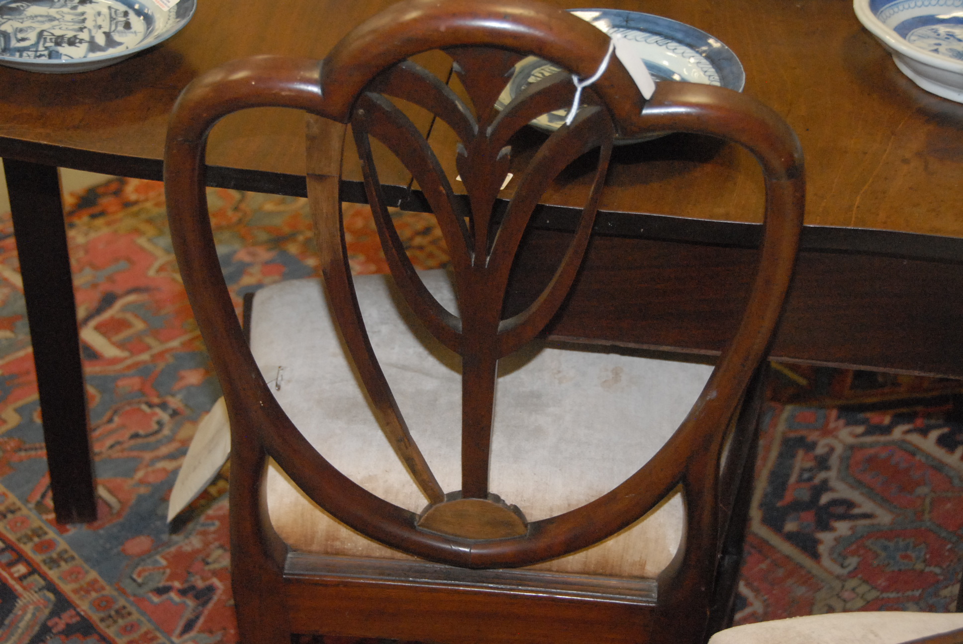 Lot 288: Set of four Federal mahogany chairs, one arm and three side, each with heart shaped backs with fleur di lis center with shaped slip seats on square tapered legs with stretchers, circa 1790-1810 imperfections. seat ht. 17 in.