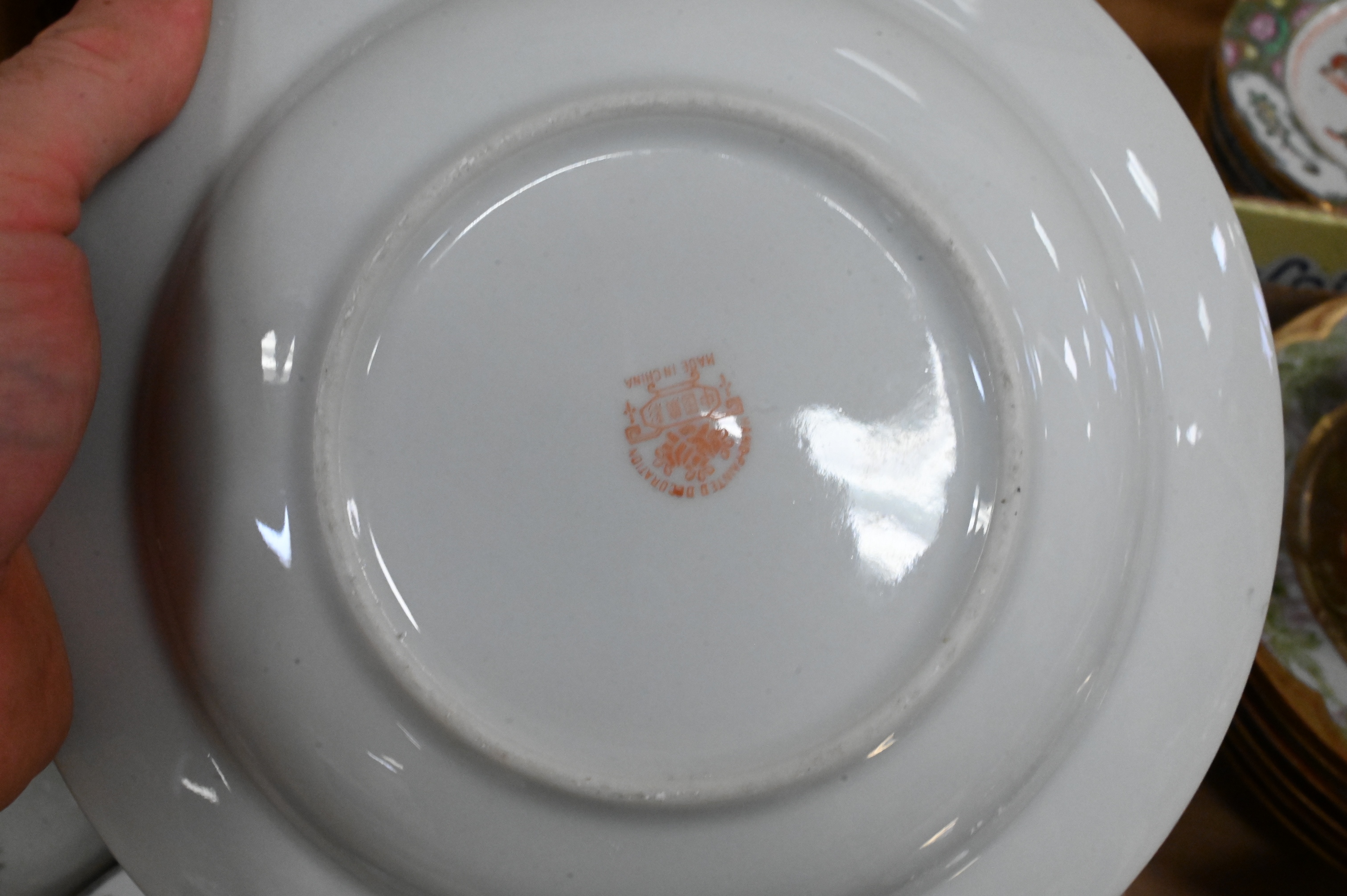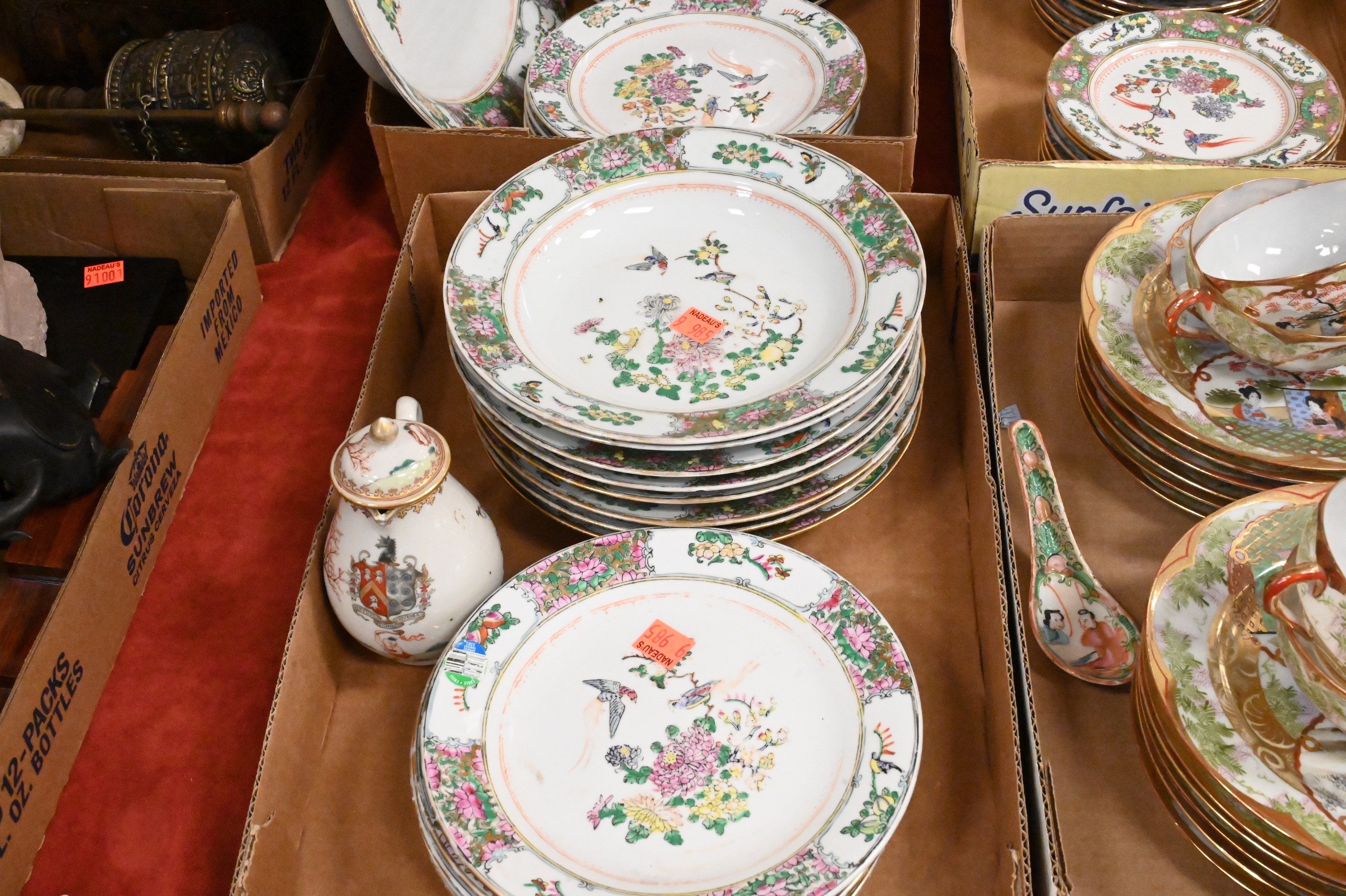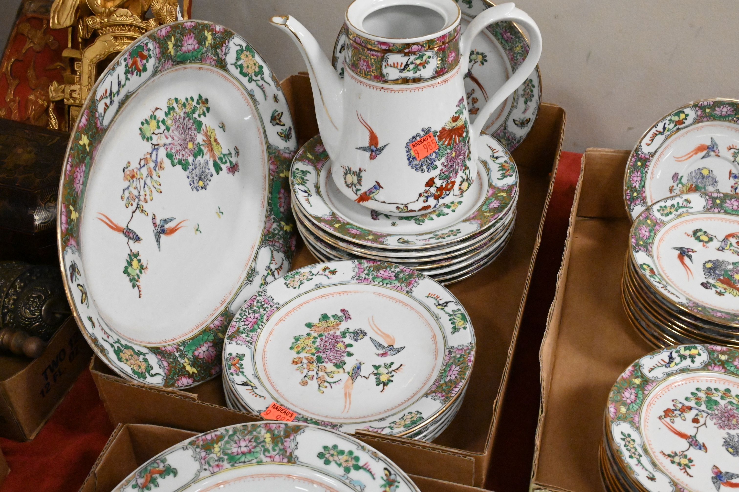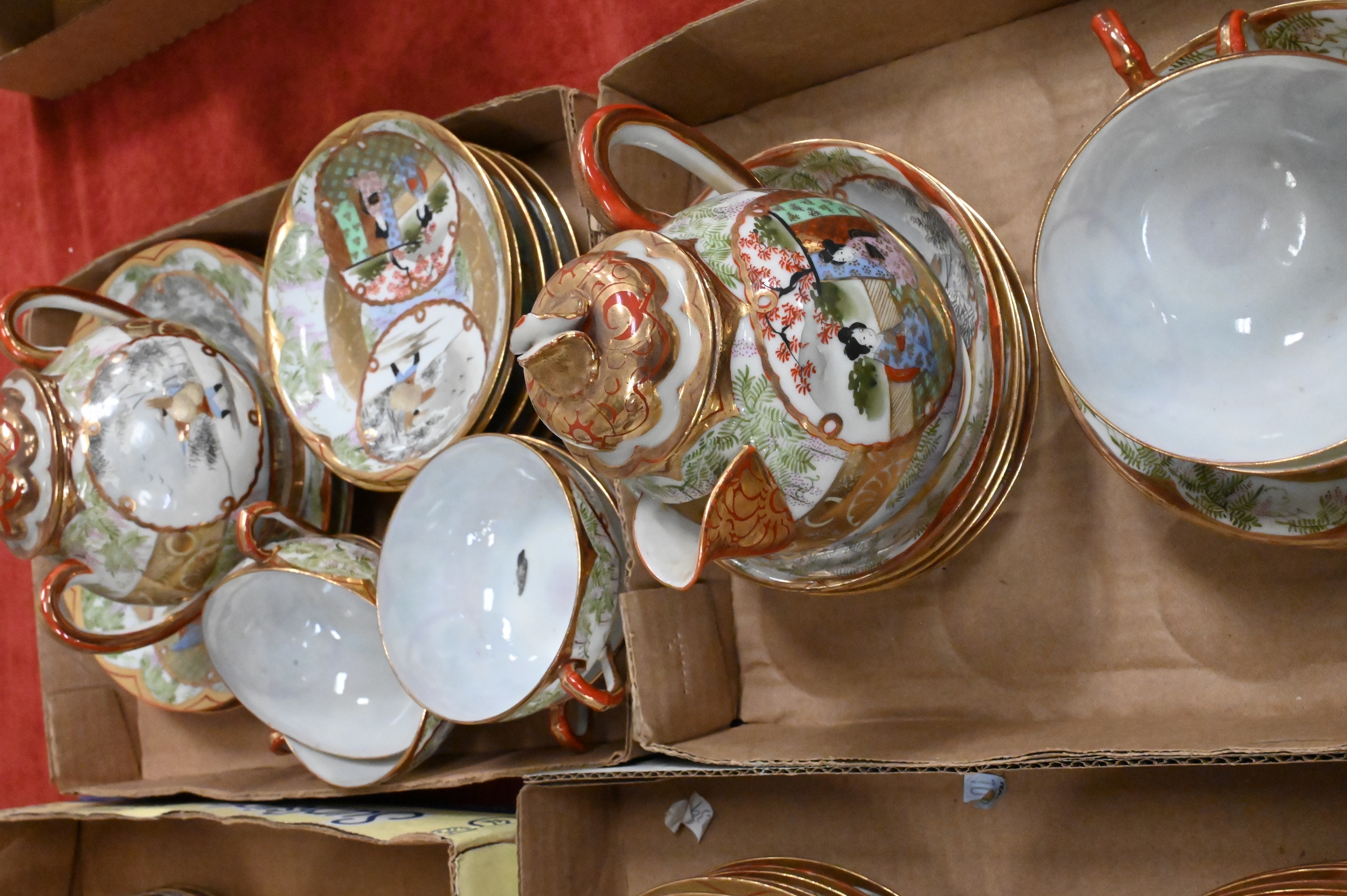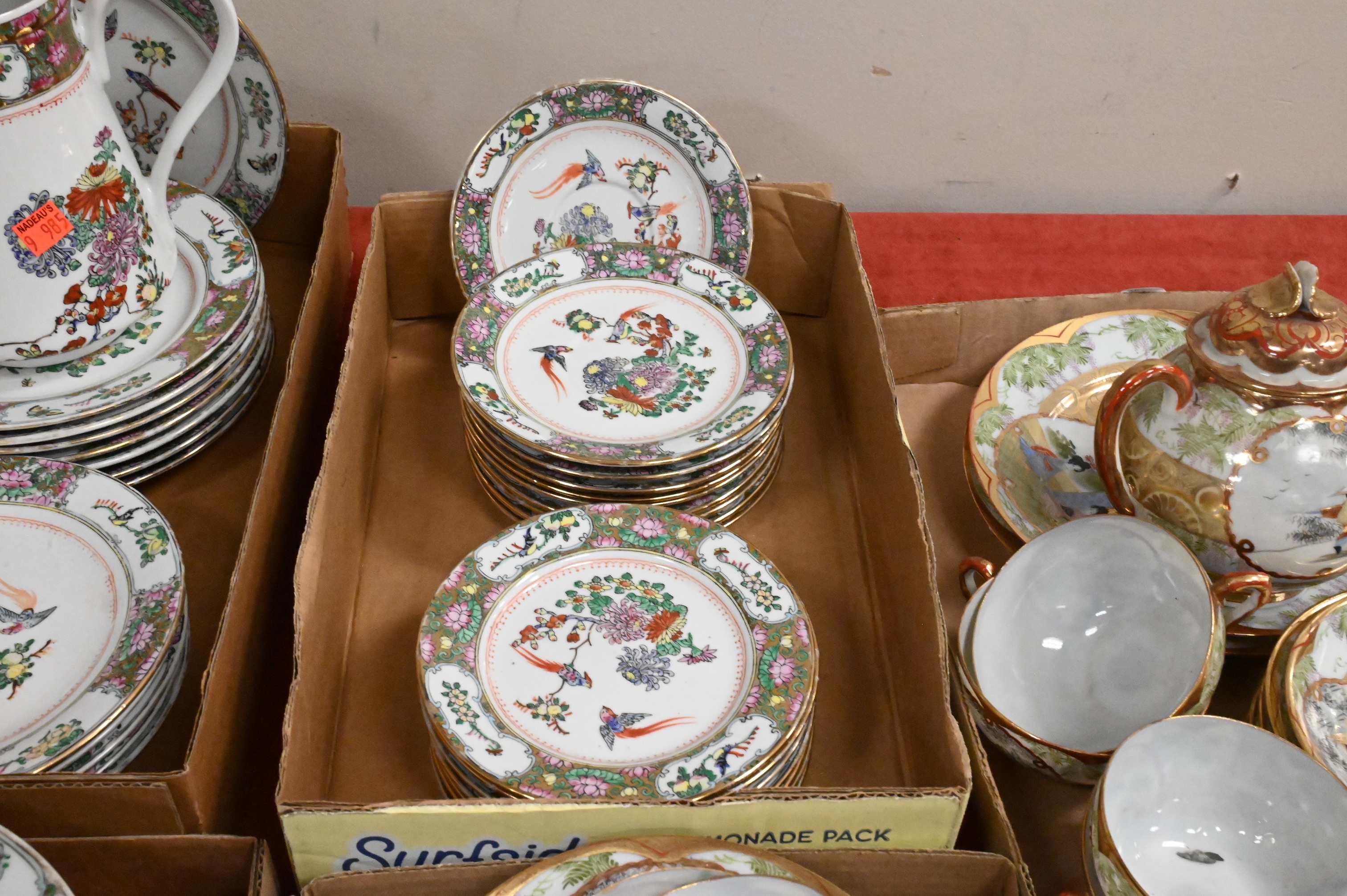 Chinese famille rose birds of paradise teapot, plates, bowls and saucers, along with Japanese Kutani partial dessert service with cream and sugar, saucers and teacups