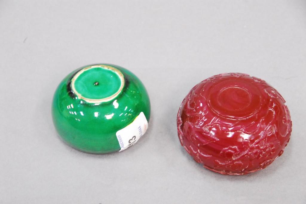Three items to include a small apple green glazed water coupe, ht 1 1/2, dia 2 3/4, a carved red glass water coupe, carved in low relief of blossoming trees, ht 1 1/2 dia 3, and a shallow blue and white phoenix bird dish, lg. 7 wd 6