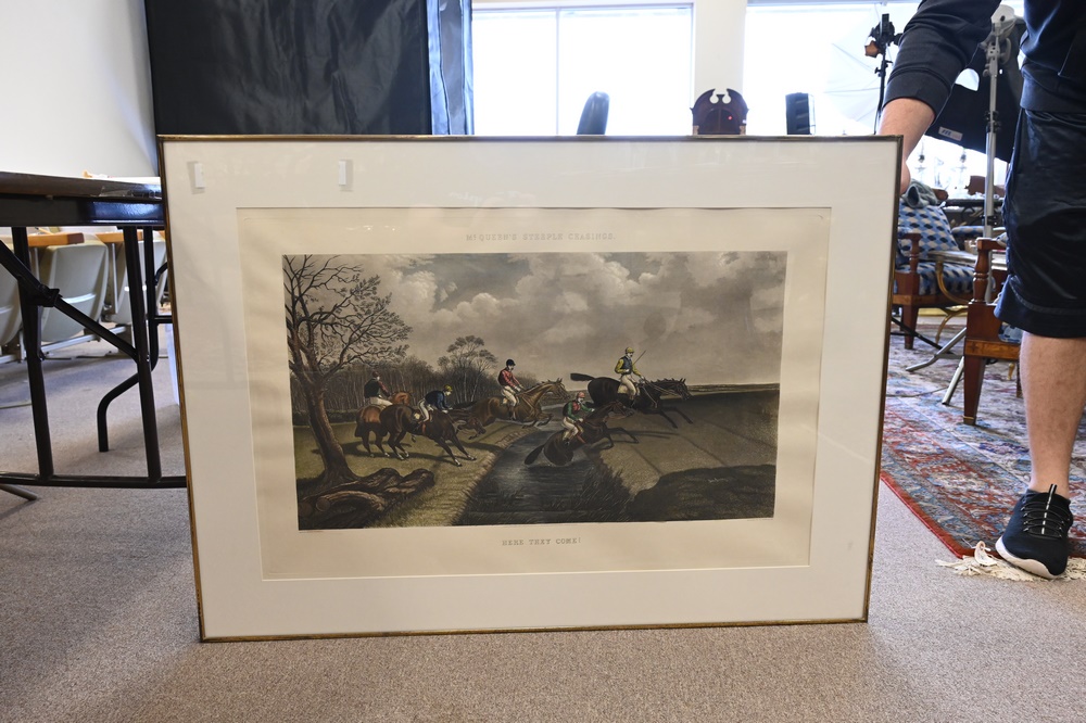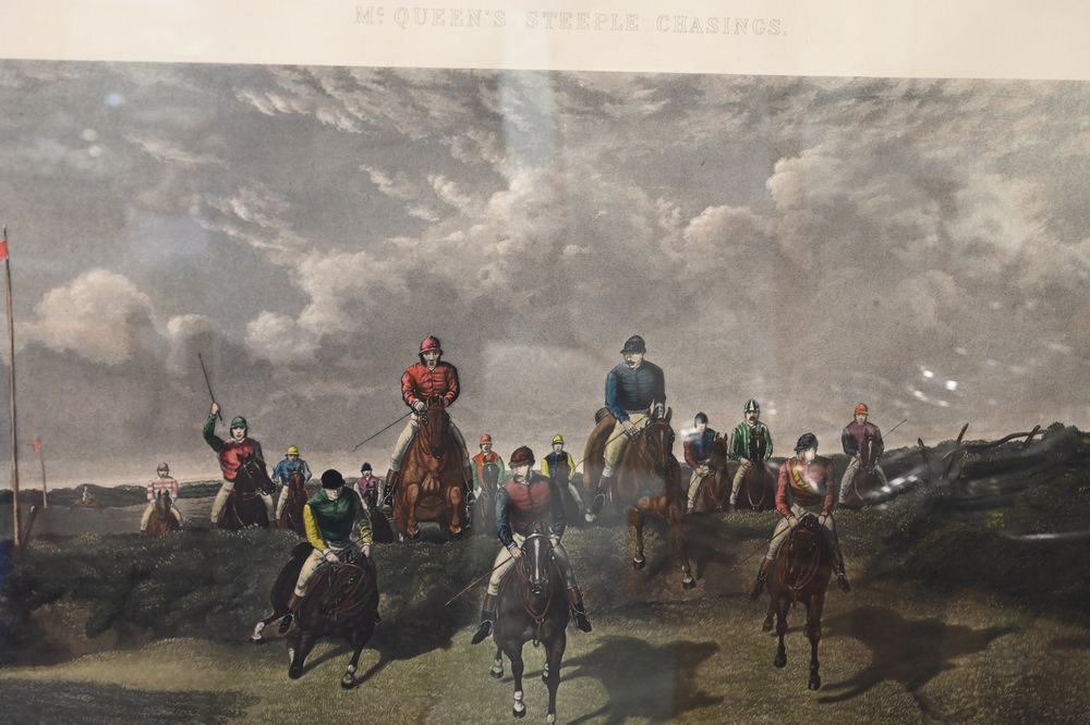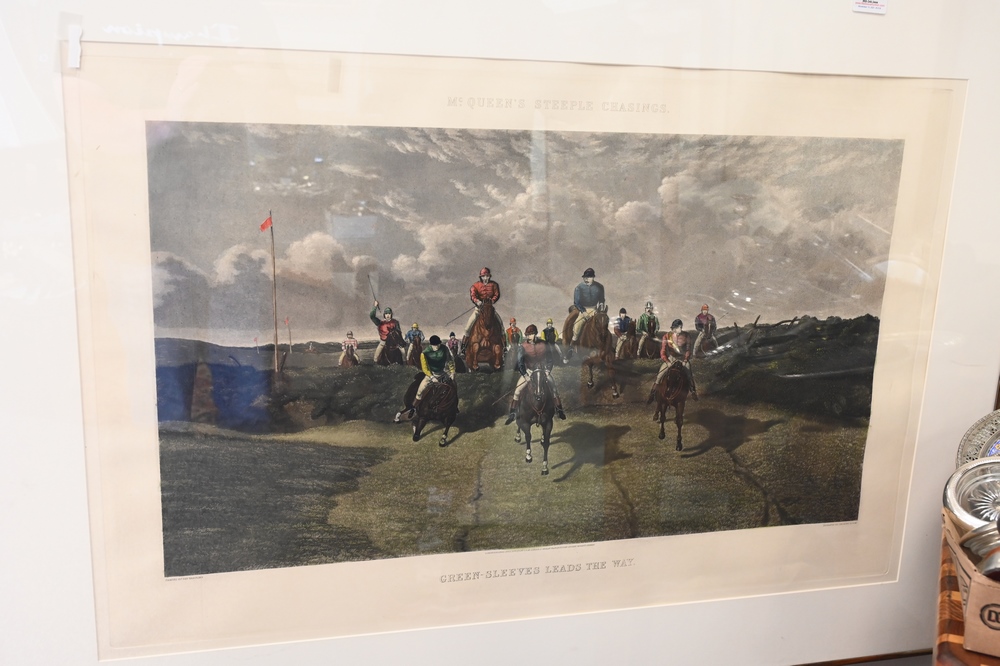 Lot 288: Two Piece Lot, to include Charles Hunt & Sons hunt scenes “Greensleeves Leads the Way (McQueen’s Steeple Chasings), 1873”; along with “Here They Come (McQueen’s Steeple Chasings), 1873”, both engravings having hand coloring on paper, both inscribed in plate along the lower margin, image size 17 x 30 inches.