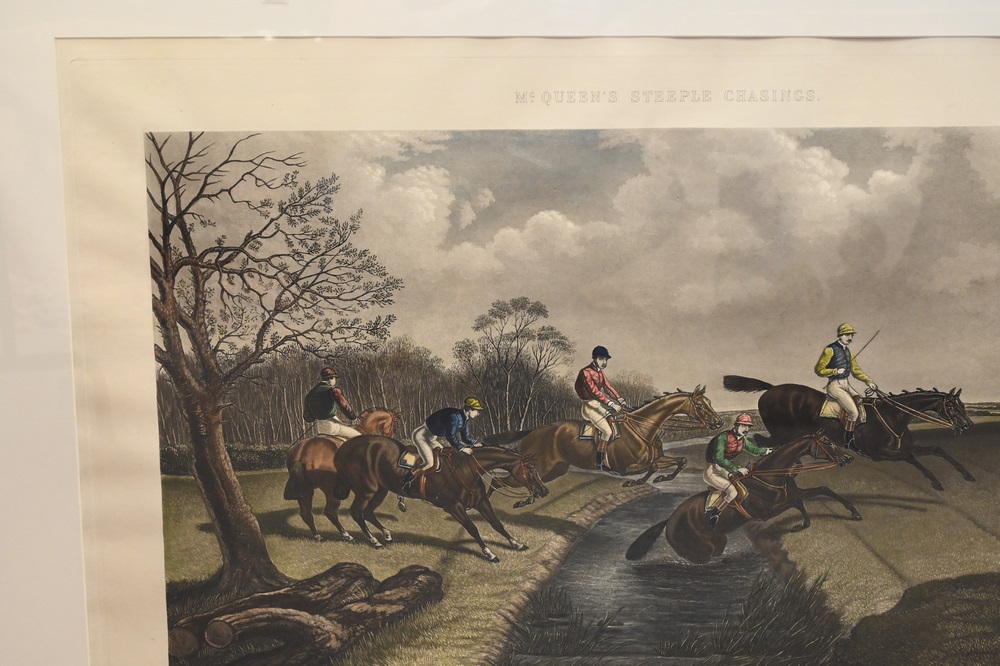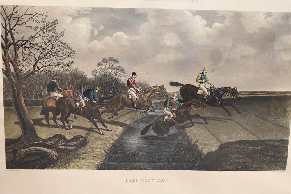Two Piece Lot, to include Charles Hunt & Sons hunt scenes “Greensleeves Leads the Way (McQueen’s Steeple Chasings), 1873”; along with “Here They Come (McQueen’s Steeple Chasings), 1873”, both engravings having hand coloring on paper, both inscribed in plate along the lower margin, image size 17 x 30 inches.