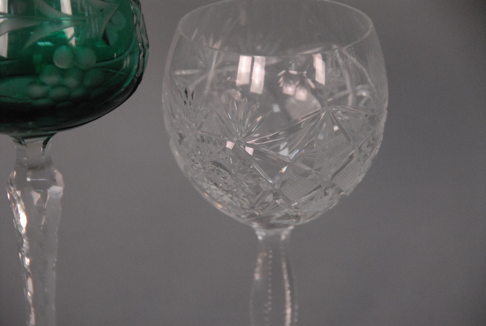 Two sets of crystal stems including six clear cut glass and six stems with green tops and clear stems.