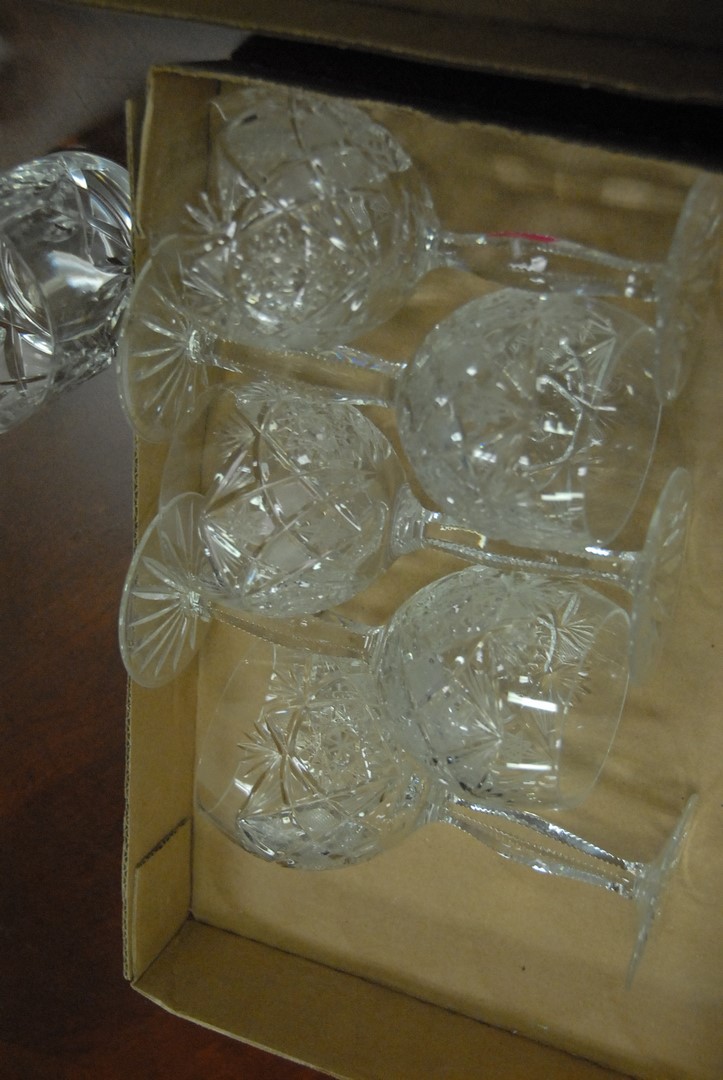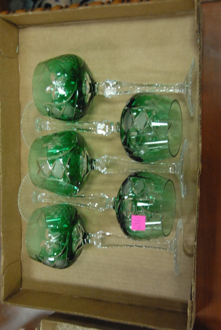 Lot 288: Two sets of crystal stems including six clear cut glass and six stems with green tops and clear stems.