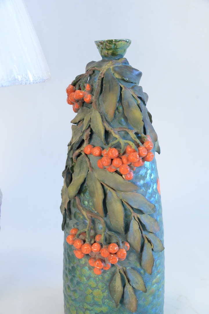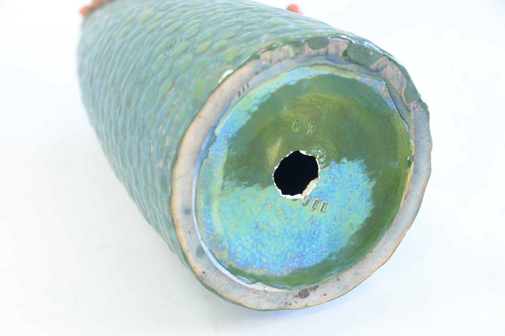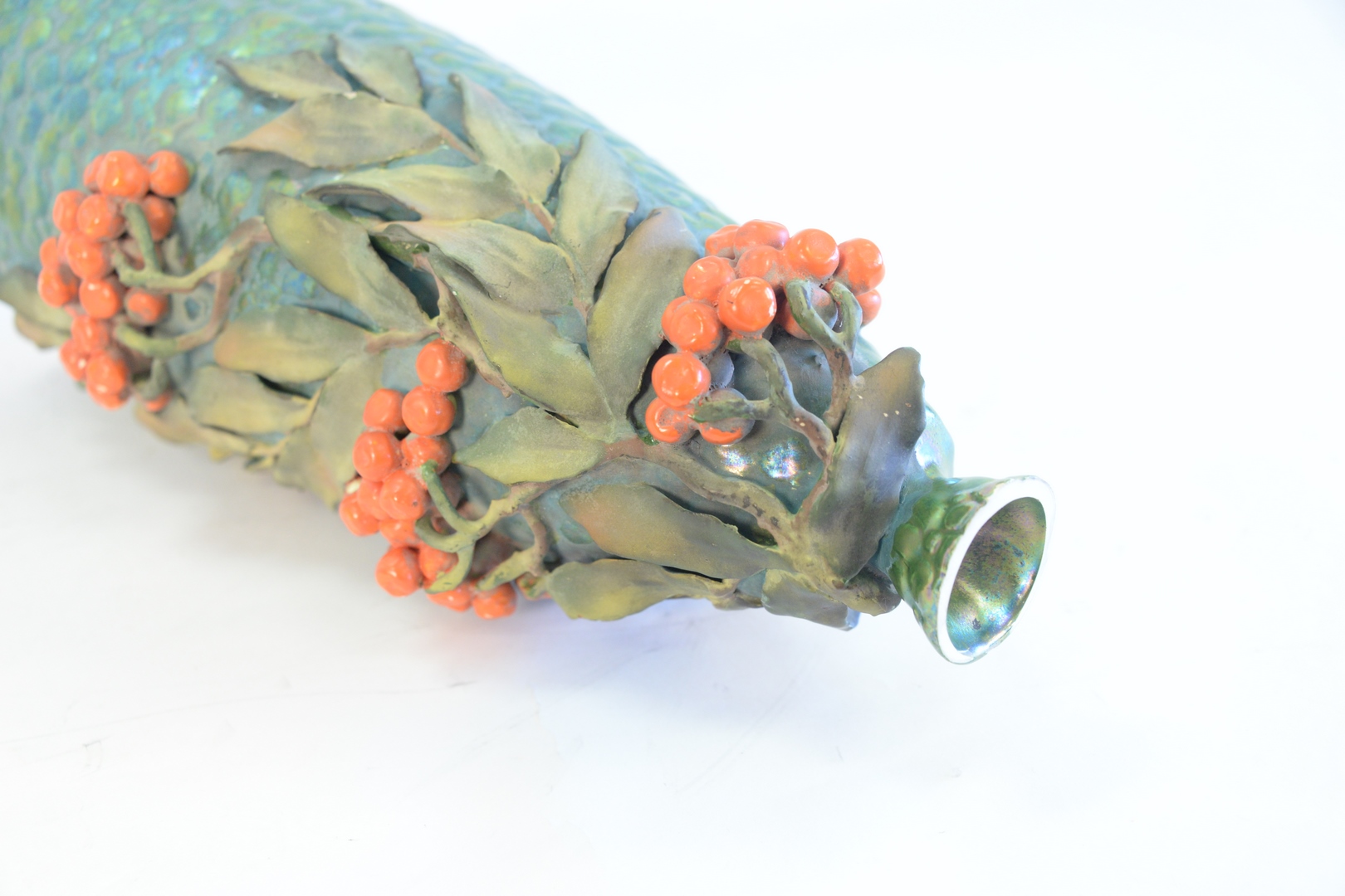 Lot 288: Two Vases Attributed to Zsolnay green iridescent glazed vase with molded leaves and berries, drill bottom, ground top rim along wi…