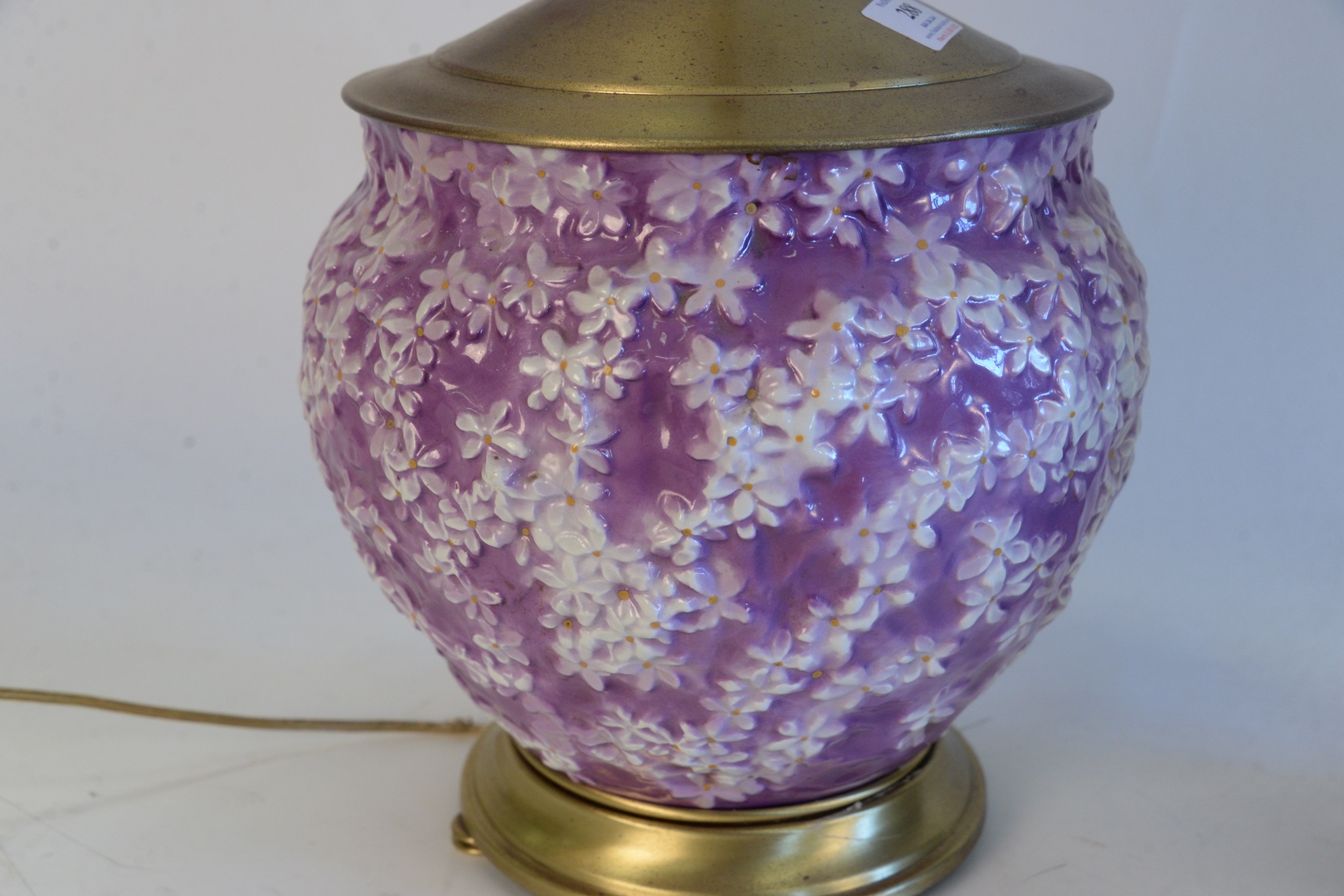 Two Vases Attributed to Zsolnay green iridescent glazed vase with molded leaves and berries, drill bottom, ground top rim along with a lilac cachepot made into a table lamp tallest height 28 inches.