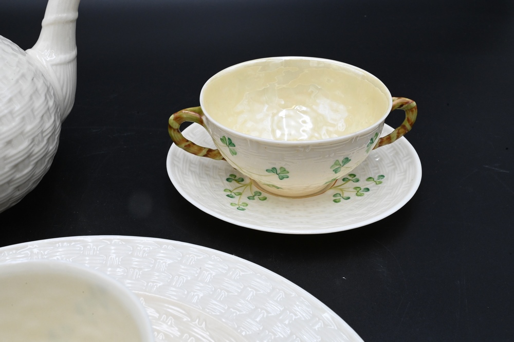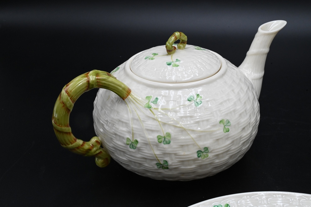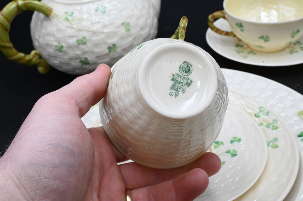 93 Piece Set of Belleek Shamrock, to include plates, cups, saucers, vases, teapots, sugars, creamers, etc., all with green mark on bottom. Provenance: Collections of Norma Reilly, New Jersey.