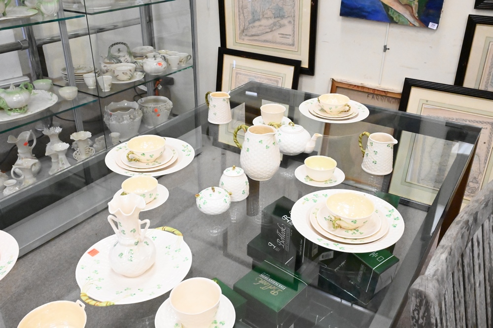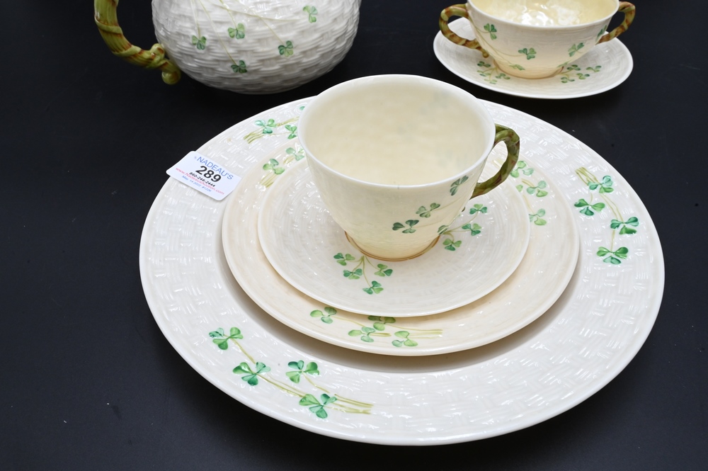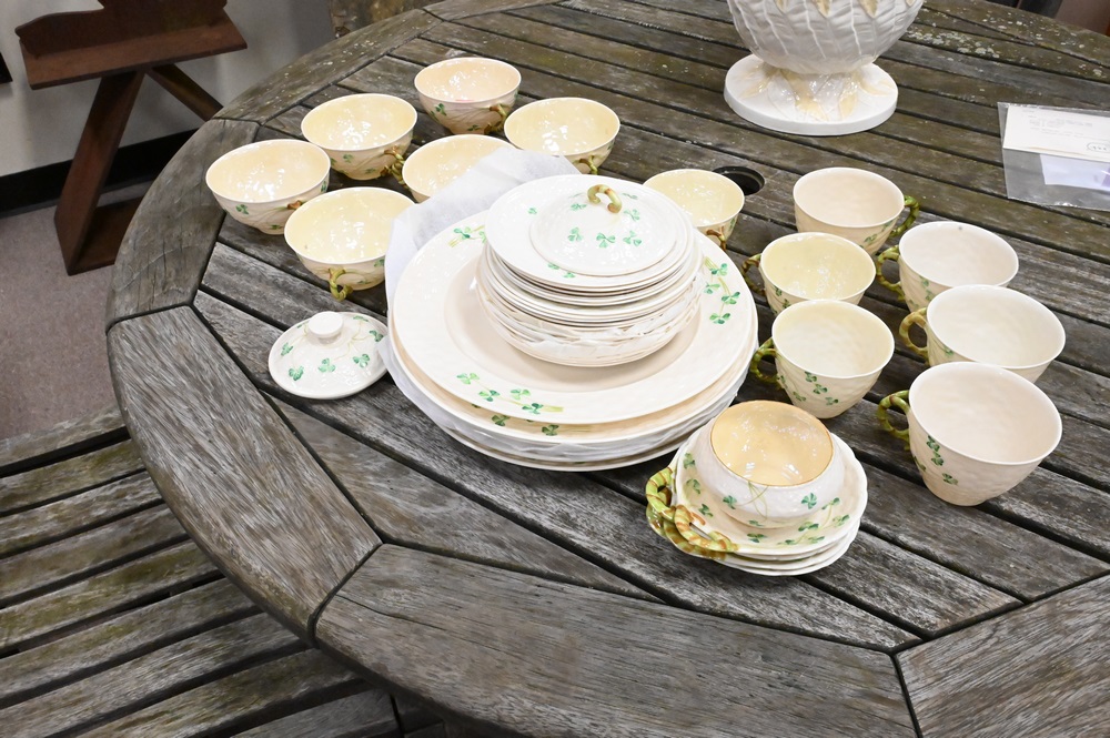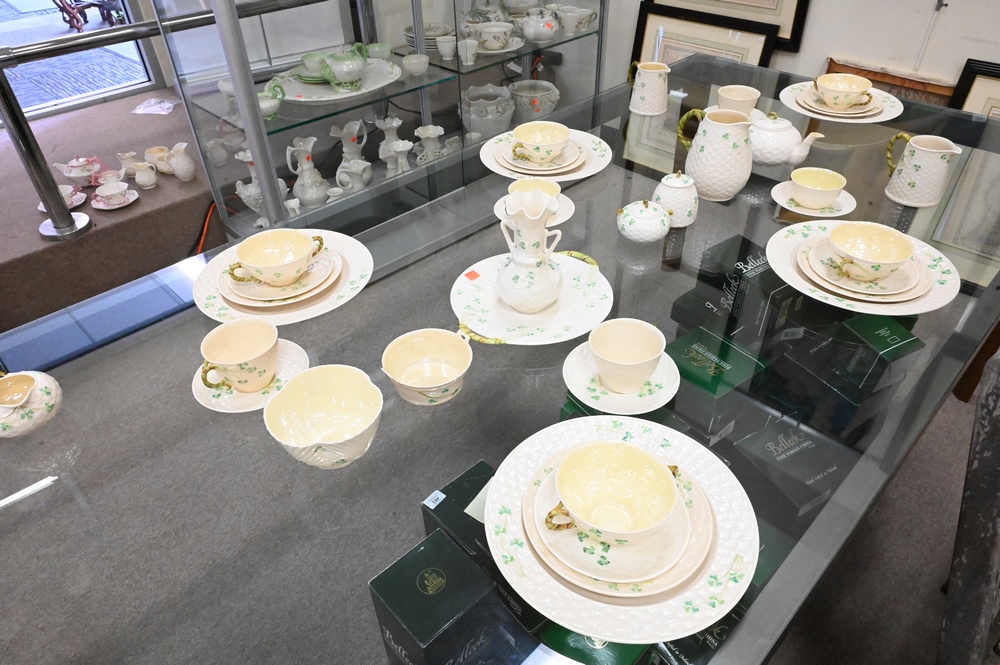 Lot 289: 93 Piece Set of Belleek Shamrock, to include plates, cups, saucers, vases, teapots, sugars, creamers, etc., all with green mark on bottom. Provenance: Collections of Norma Reilly, New Jersey.