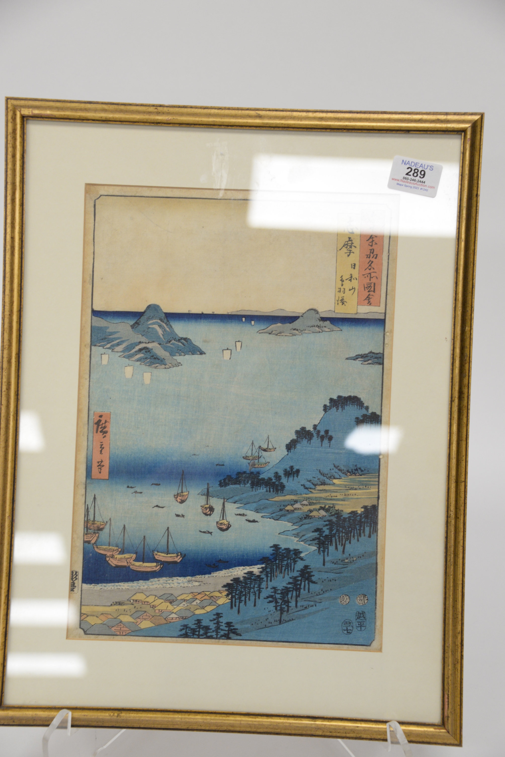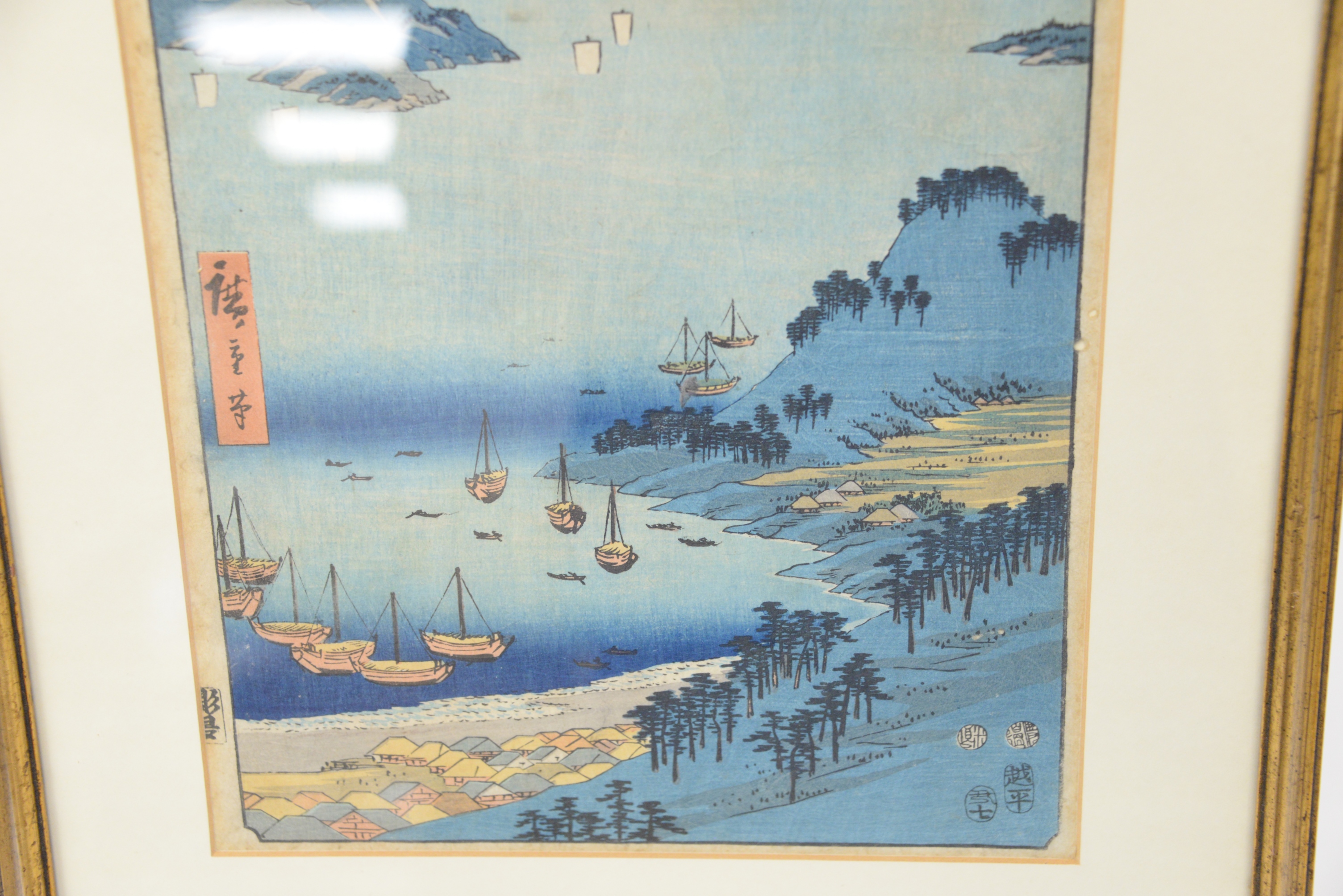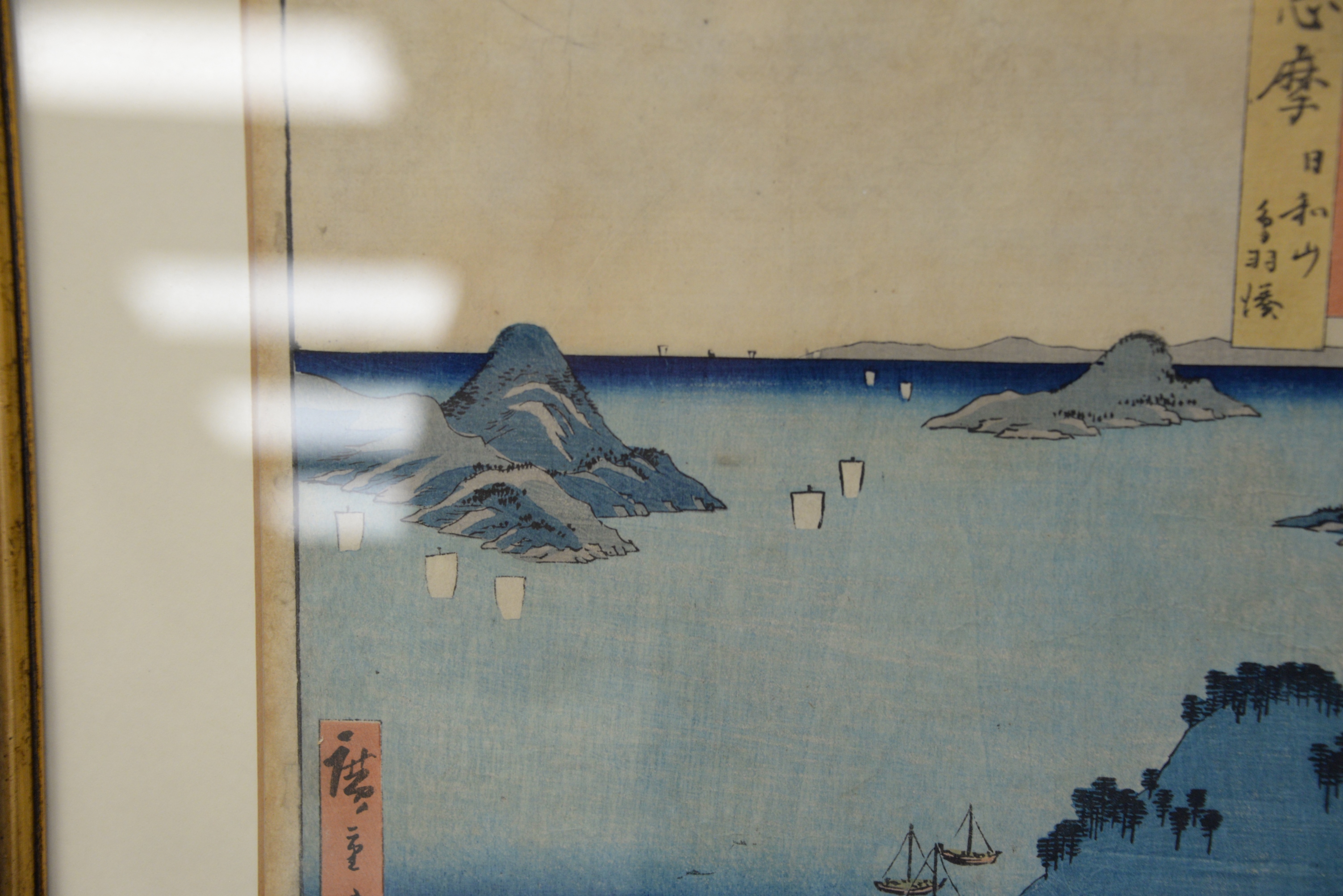 Ando Hiroshige Japanese Woodblock Print Shima Province Mount Hiyori And Toba Harbor from famous places in the sixty-odd provinces, 1853 11 1/8″ x 9″, 11″ x 7″.