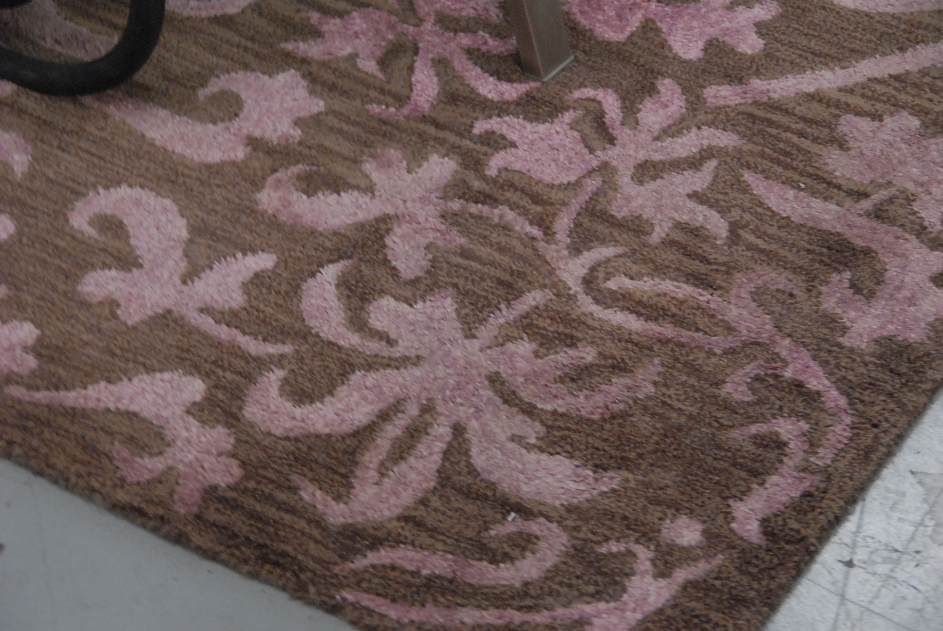Custom tan and pink Company C rug, 6′ x 8’7.