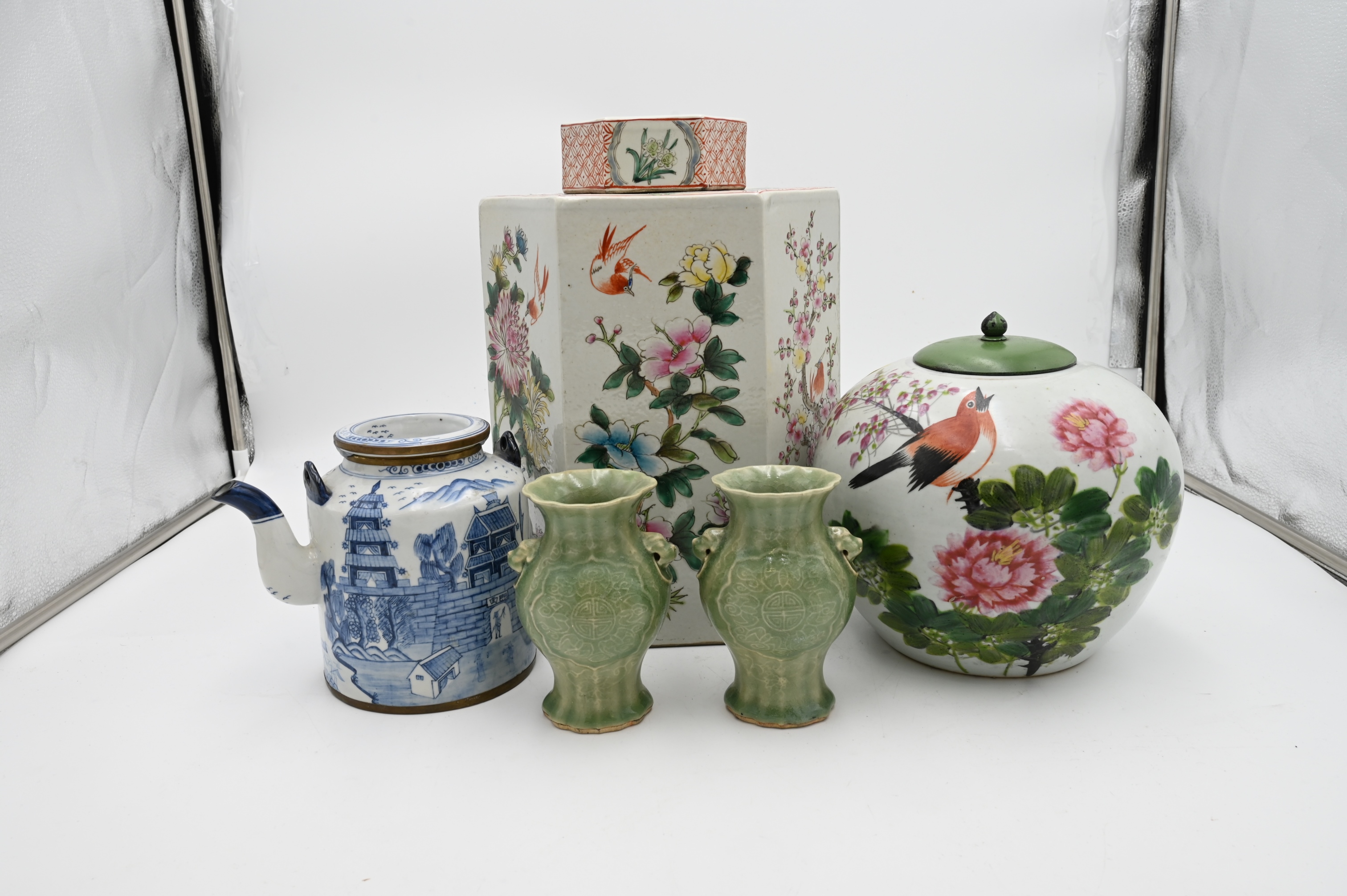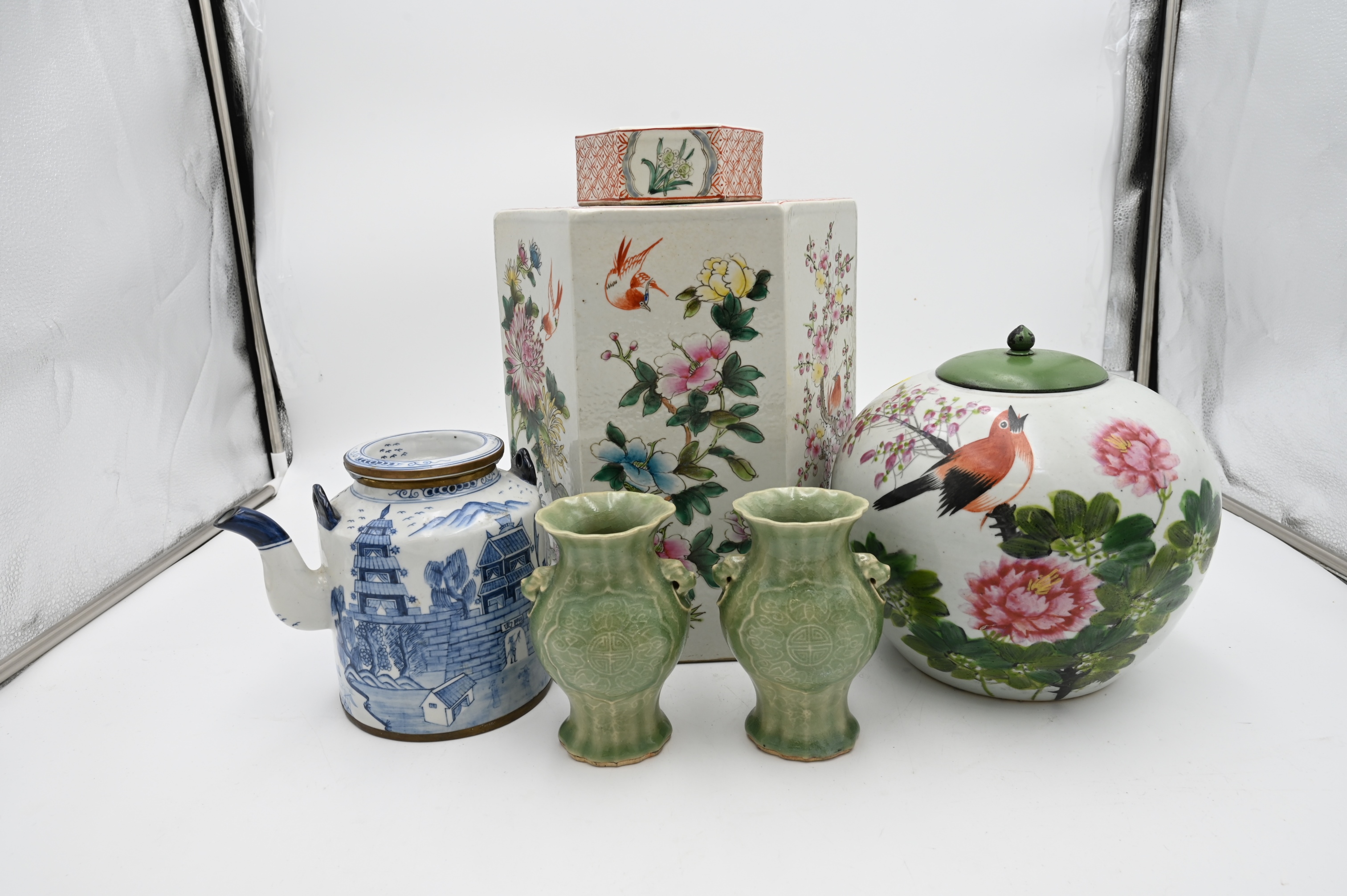 Five Piece Chinese Lot, to include two covered jars, pair of vases, and teapot height 5 1/2 inches – 13 1/2 inches