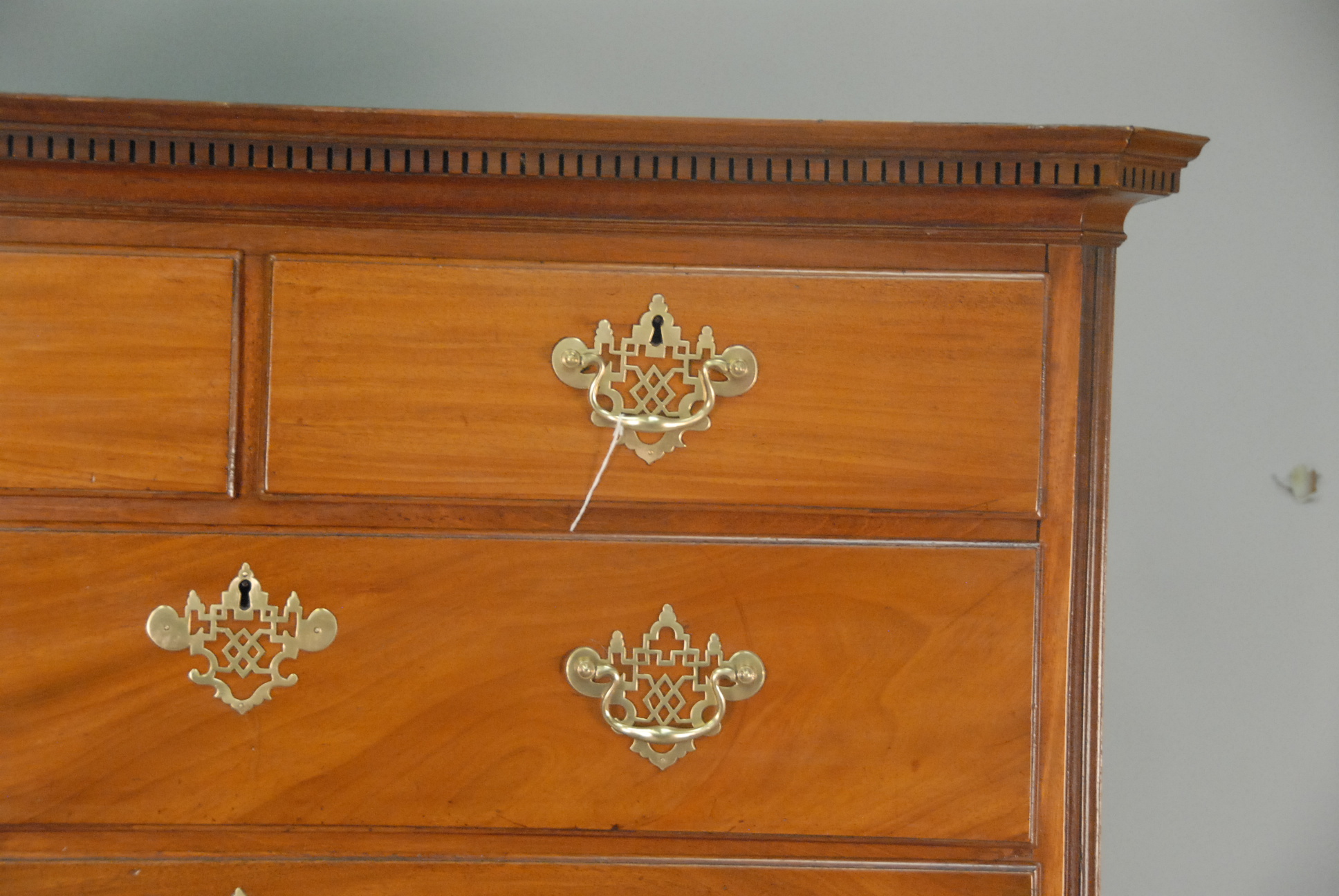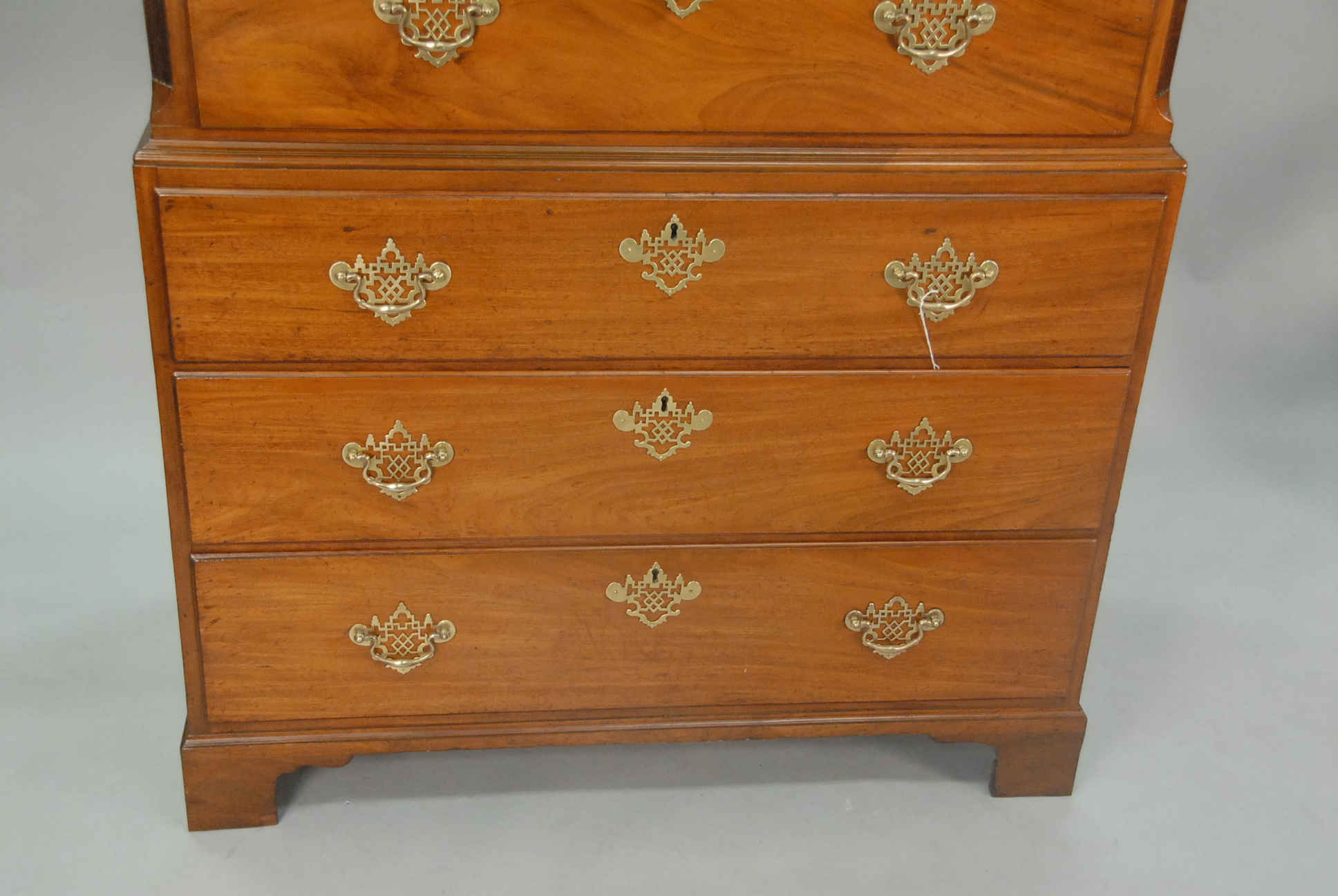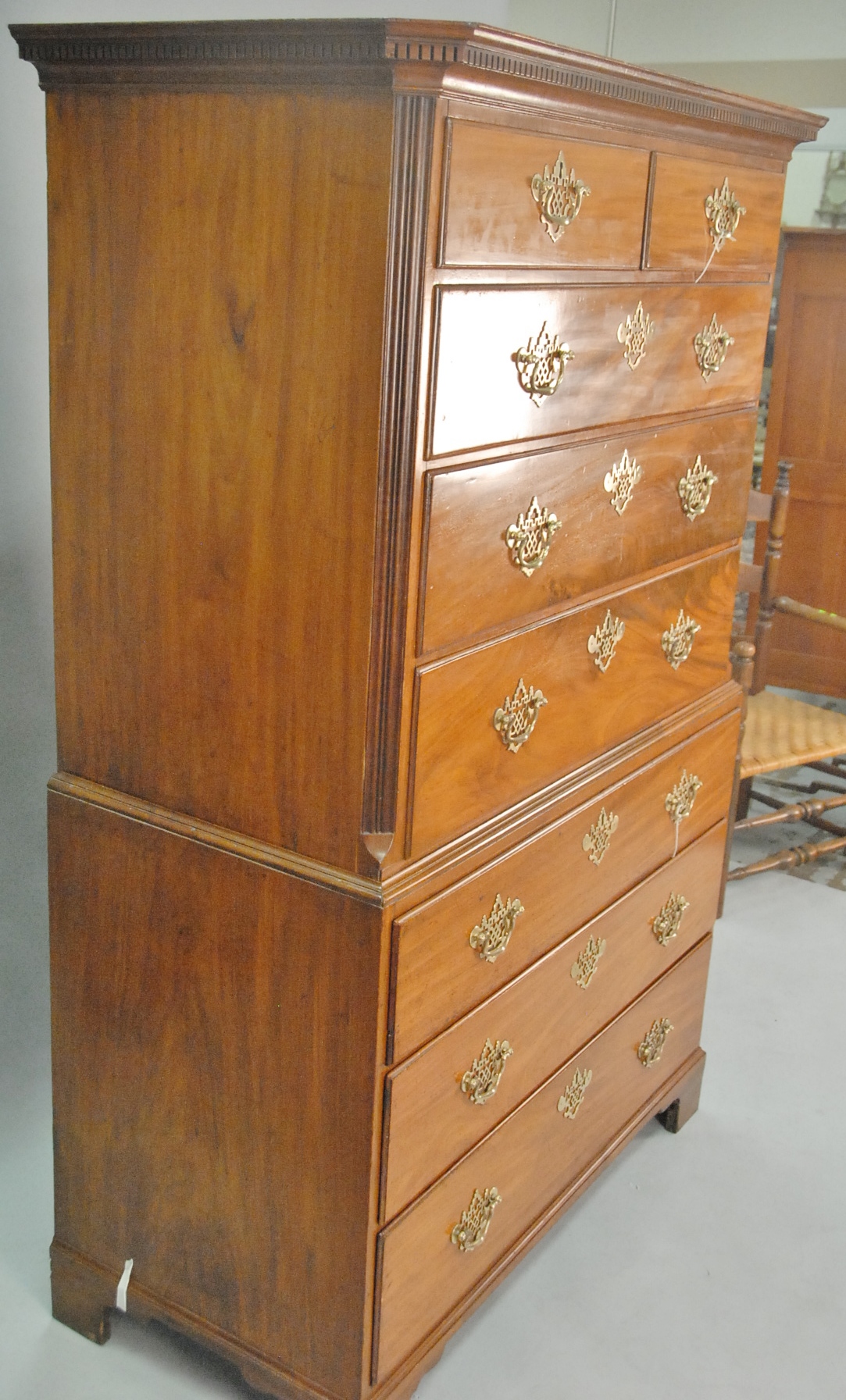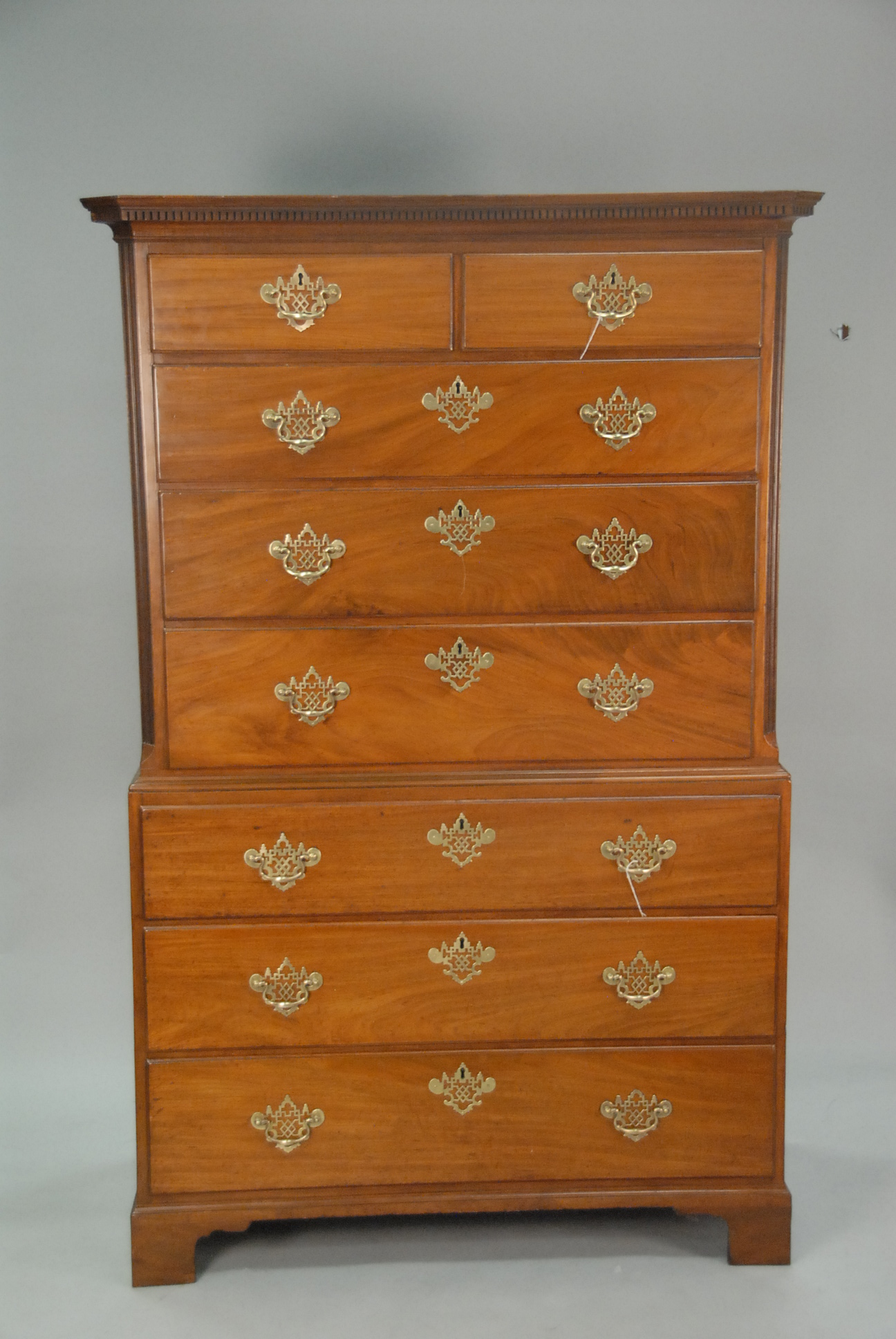 Lot 289: George III walnut chest on chest in two parts, upper section having two drawers over three drawers on base with three drawers on cut out bracket base. ht. 70 1/2in., wd. 42in.