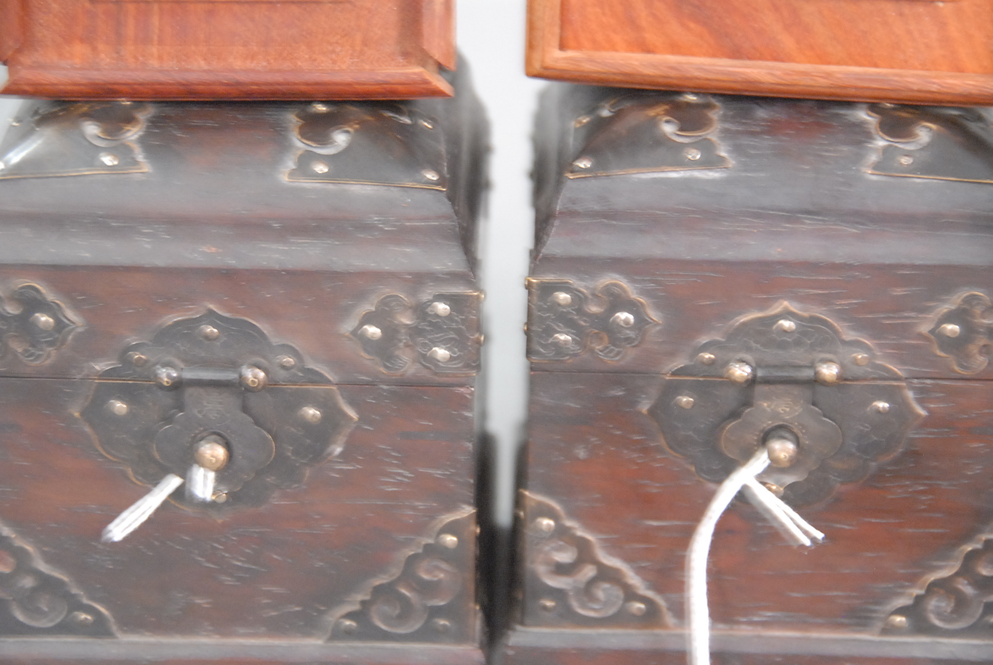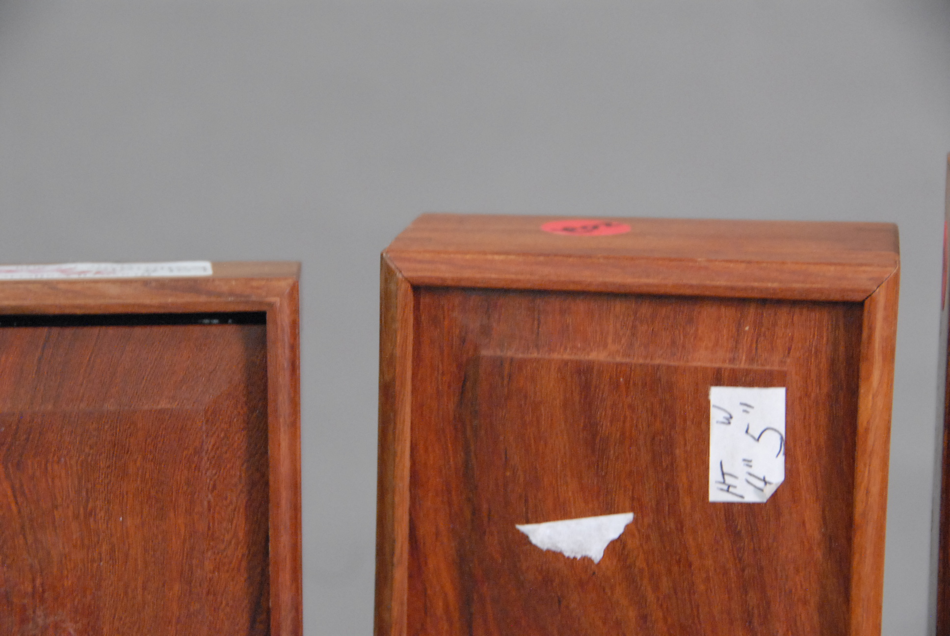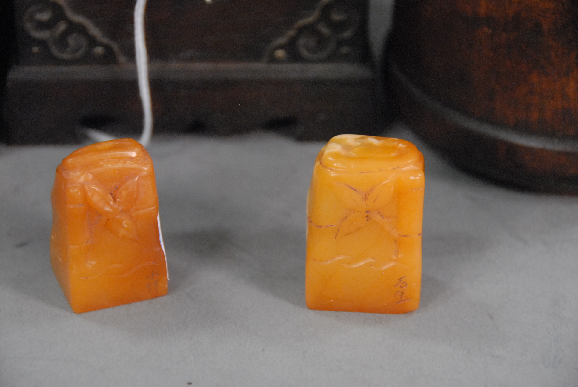 Group lot to include five carved wood boxes, two soapstone seals and a brush pot.